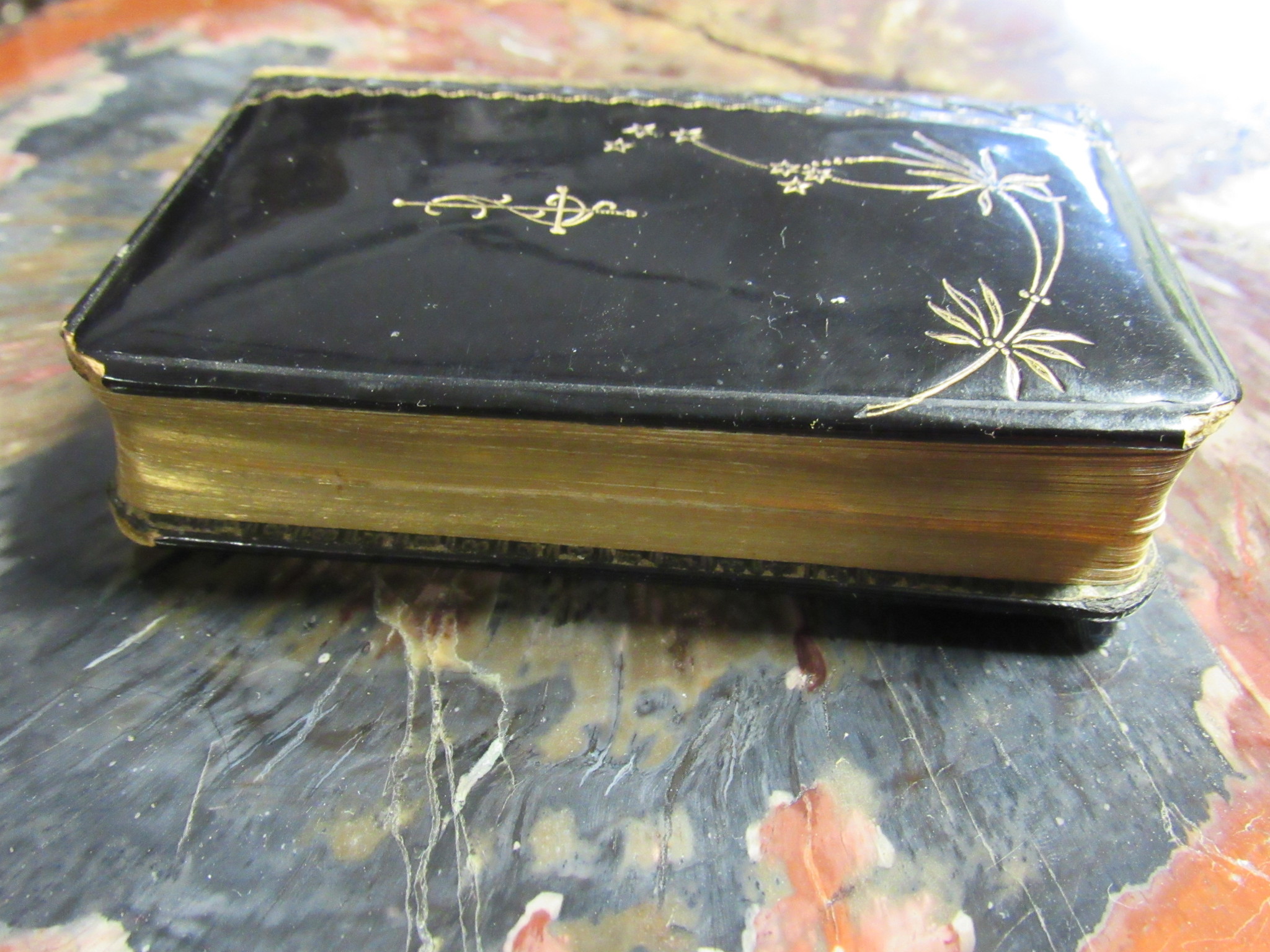 Ausführung: Umlaufender Goldschnitt, schwarzer, gepolsterter Einband mit prachtvoller Goldstaffage-Ornamentik und geprägtem Buchrücken.