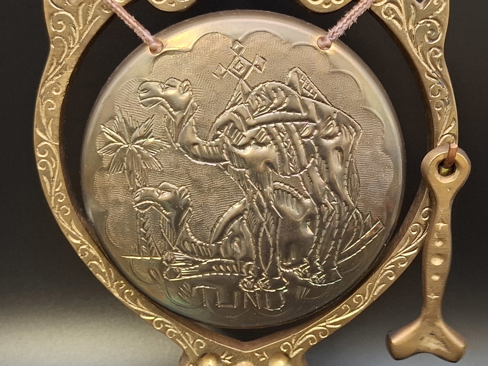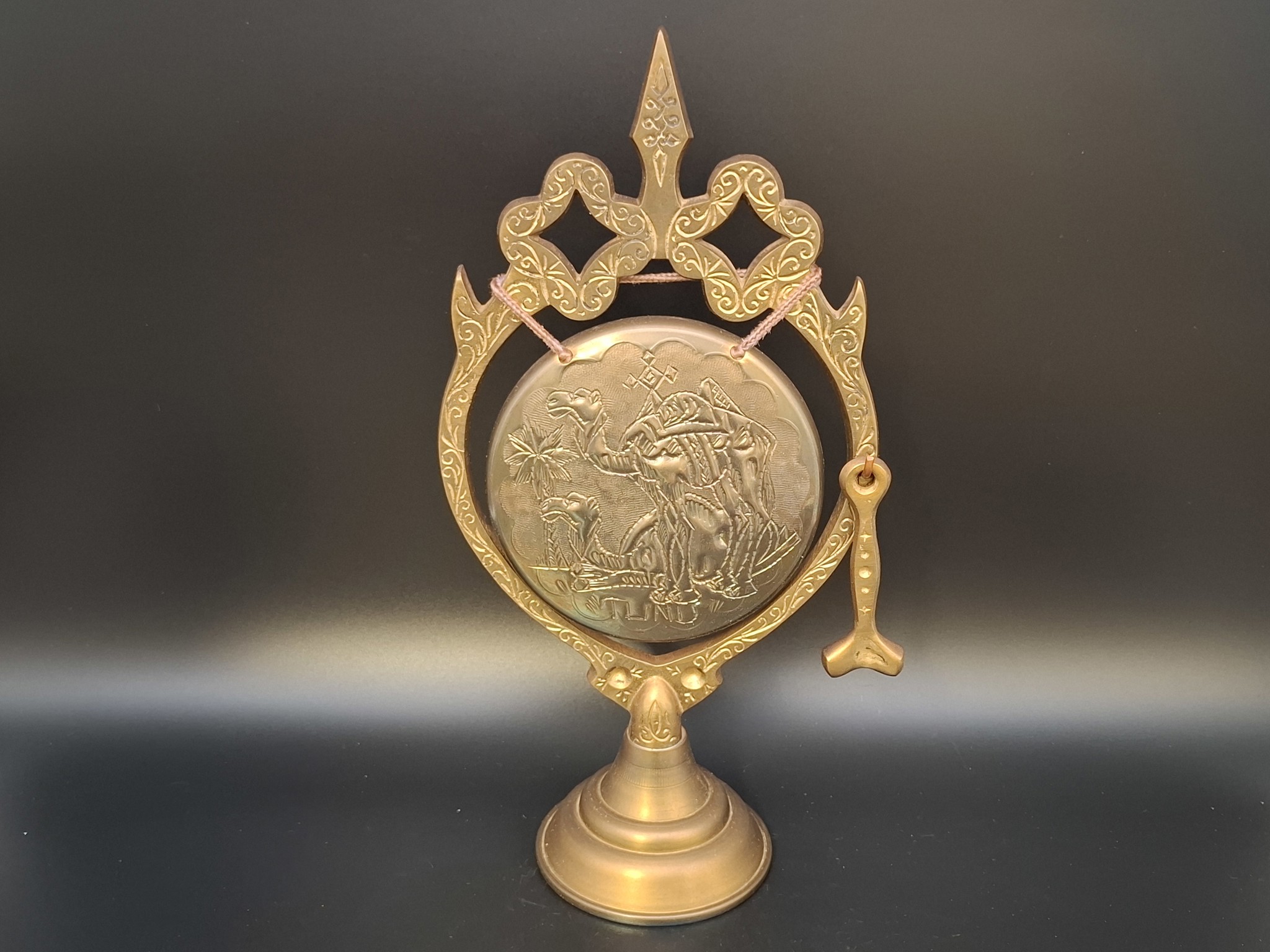 Dekor: Wunderschöne, handgearbeitete Oasen-Szenerie mit Dromedaren (einhöckriges Kamel) und Palmen. Markante „Tunis“-Gravur auf dem Gong-Spiegel.