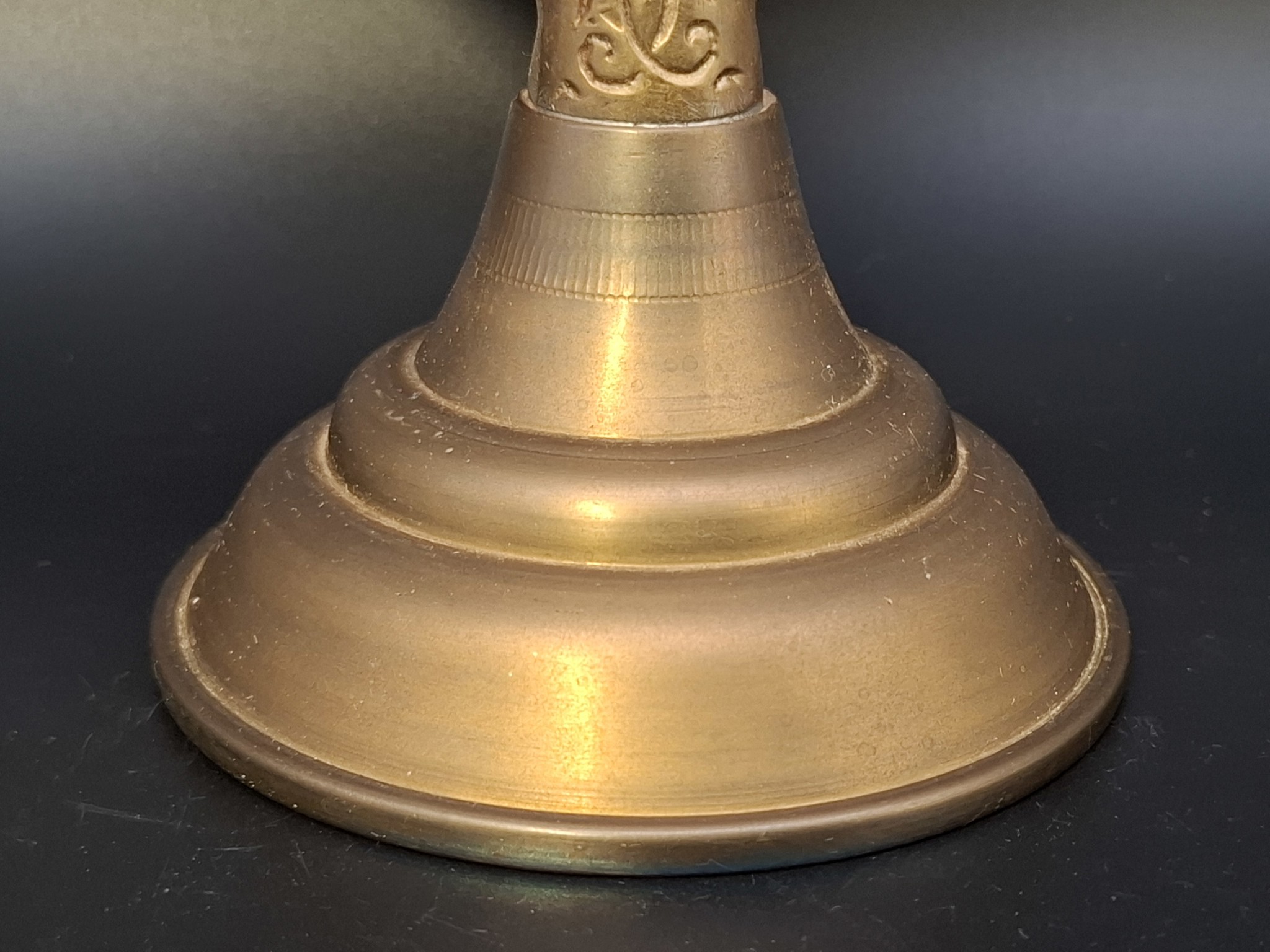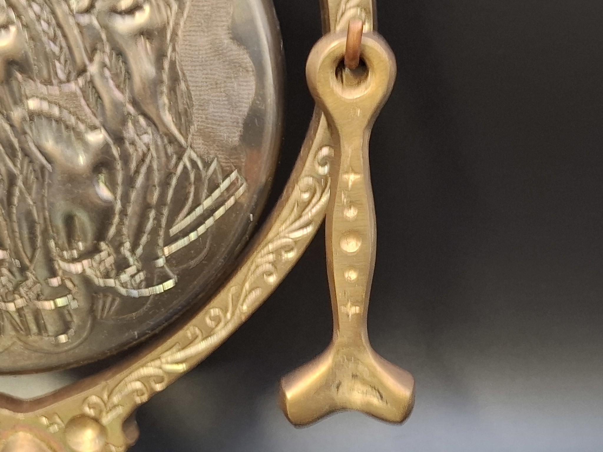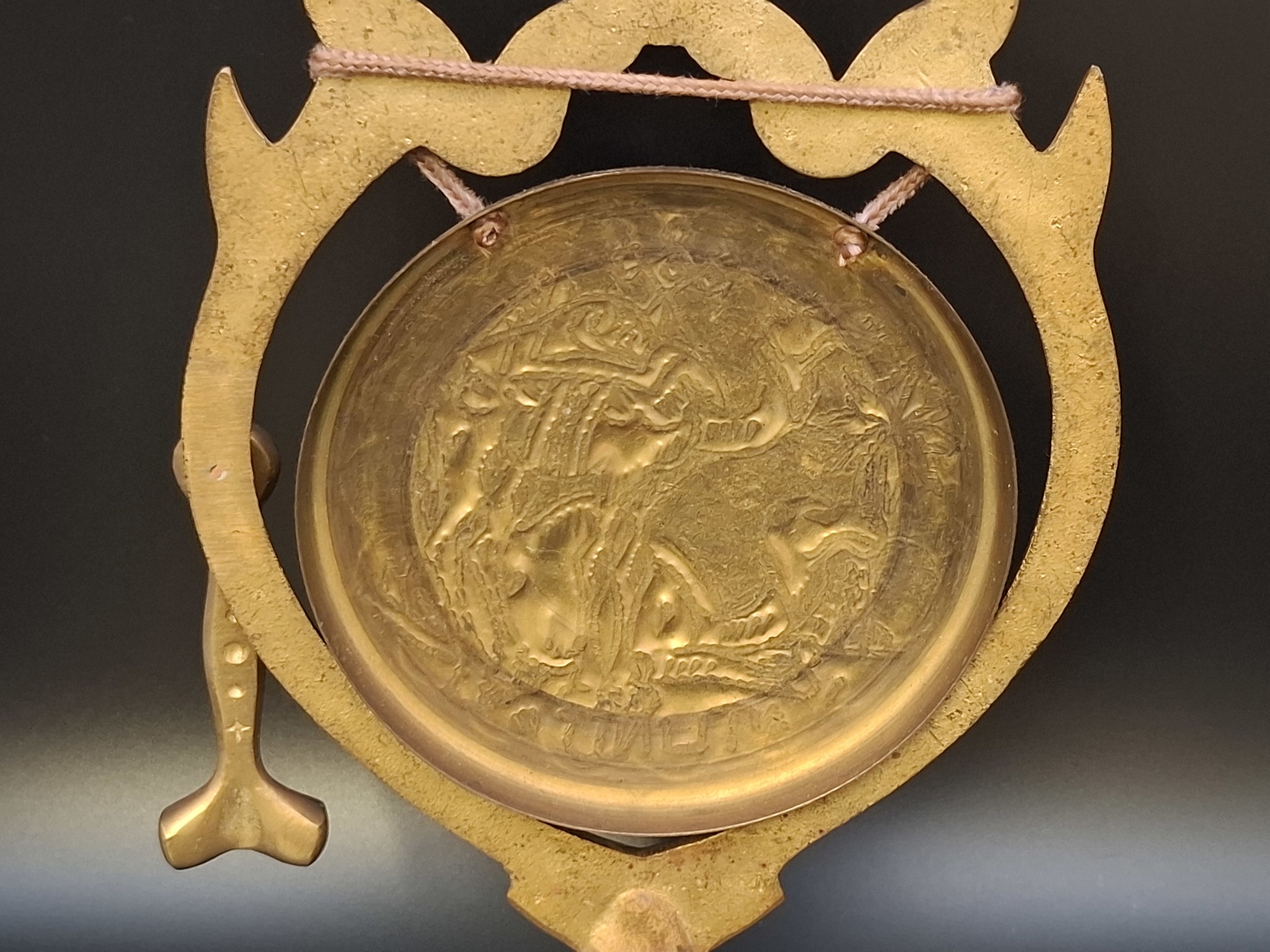 Material: Gestell aus massivem Messingguss; Gong-Scheibe aus getriebenem/ziseliertem Messing.
