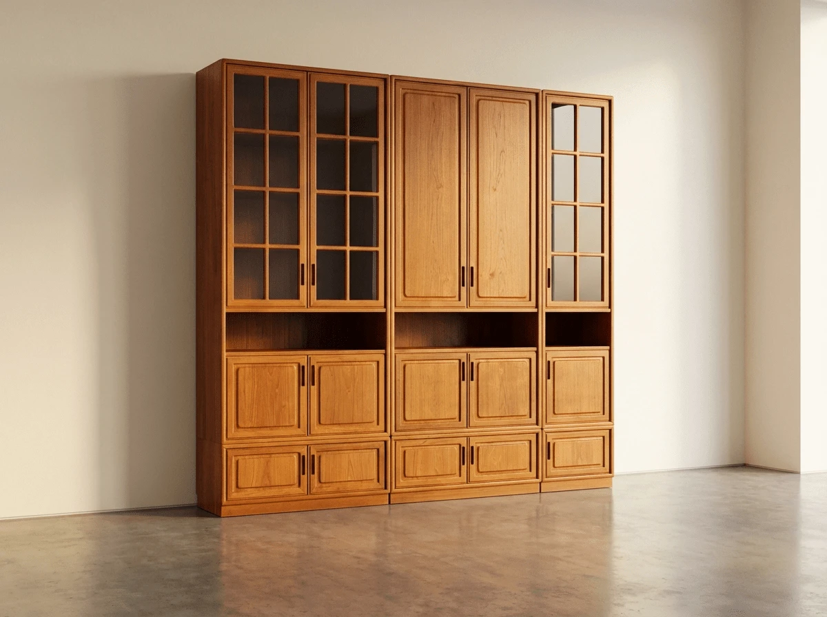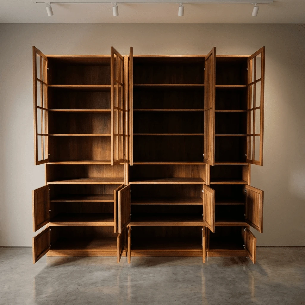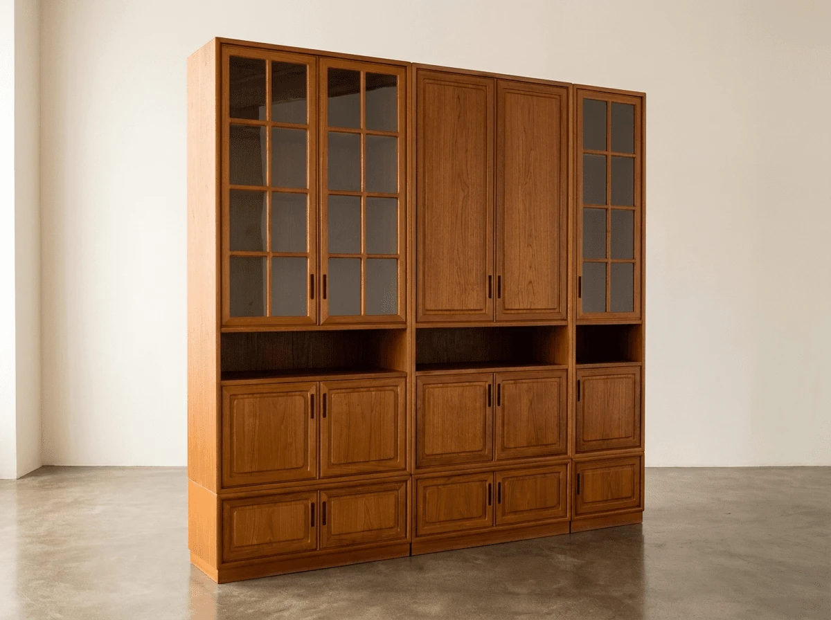 Außenbereiche (Links & Rechts): Geschlossene Türen im Sockel, darüber ein offenes Fach und elegante Vitrinentüren mit Glas und feinen Holzstreben. Jede Vitrine bietet vier Ebenen zur Präsentation Ihrer Exponate.