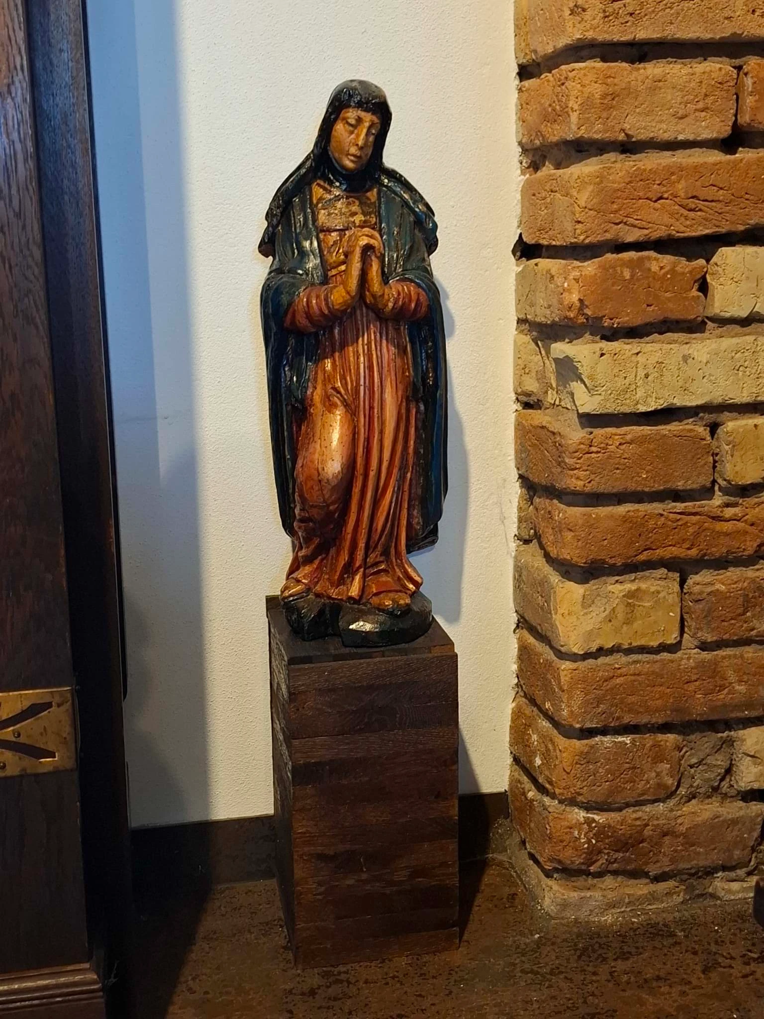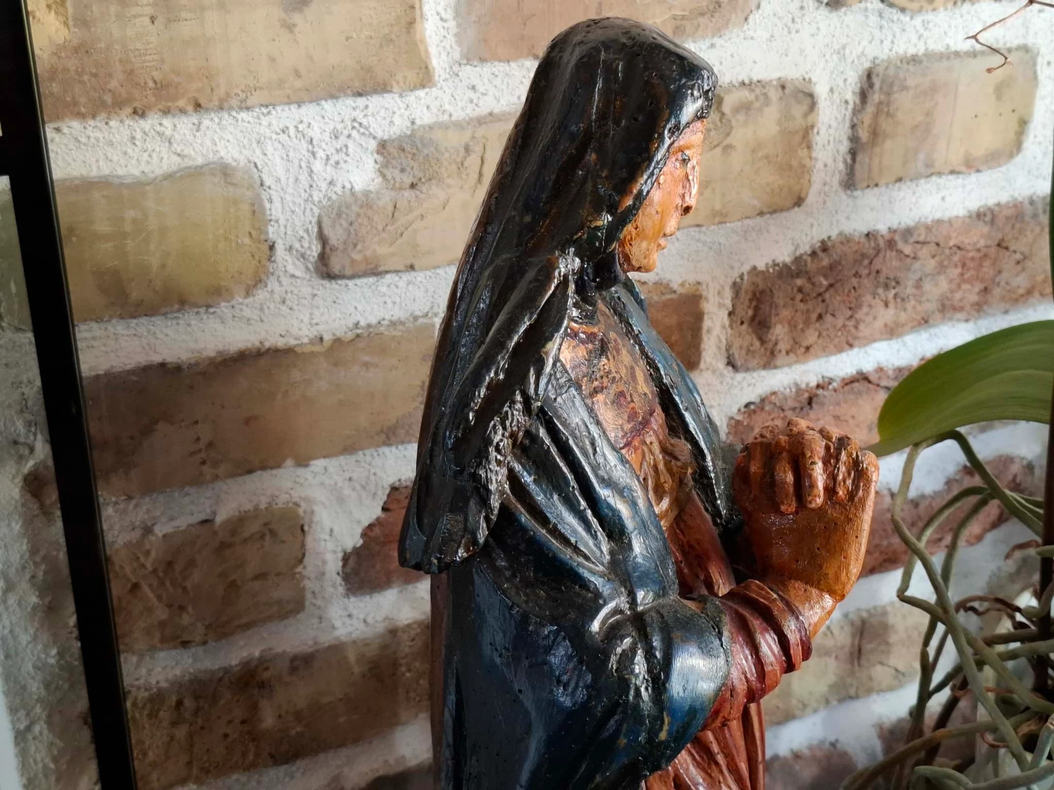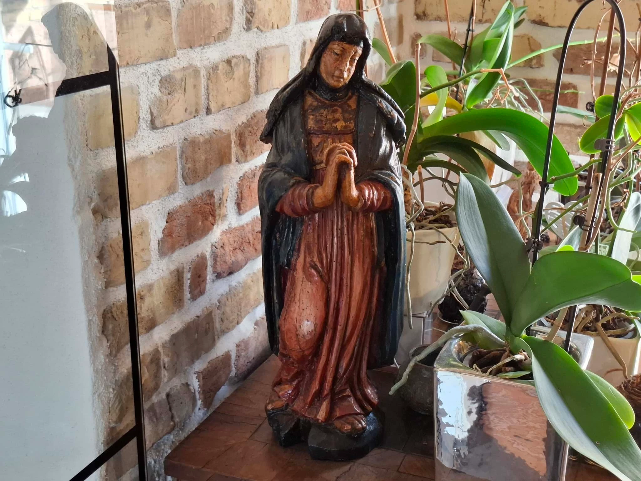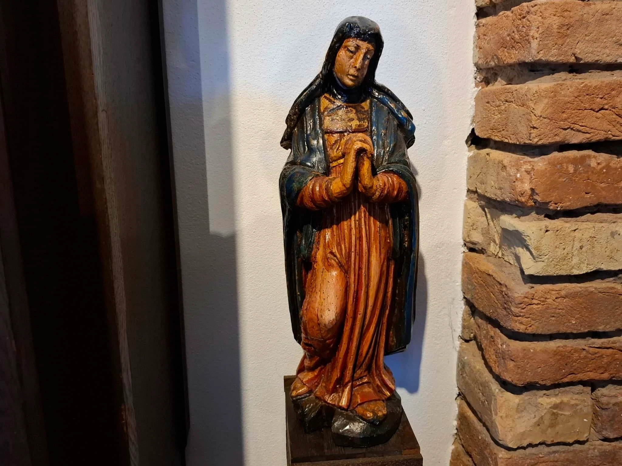 Diese ausdrucksstarke, polychrom gefasste Holzskulptur zeigt die Jungfrau Maria in betender Haltung (Maria Orans), ein im ländlichen Raum populäres Andachtsmotiv. Die Figur ist mit einer Höhe von ca. 51 cm für einen Hausaltar oder eine Wandkonsole sehr präsent.