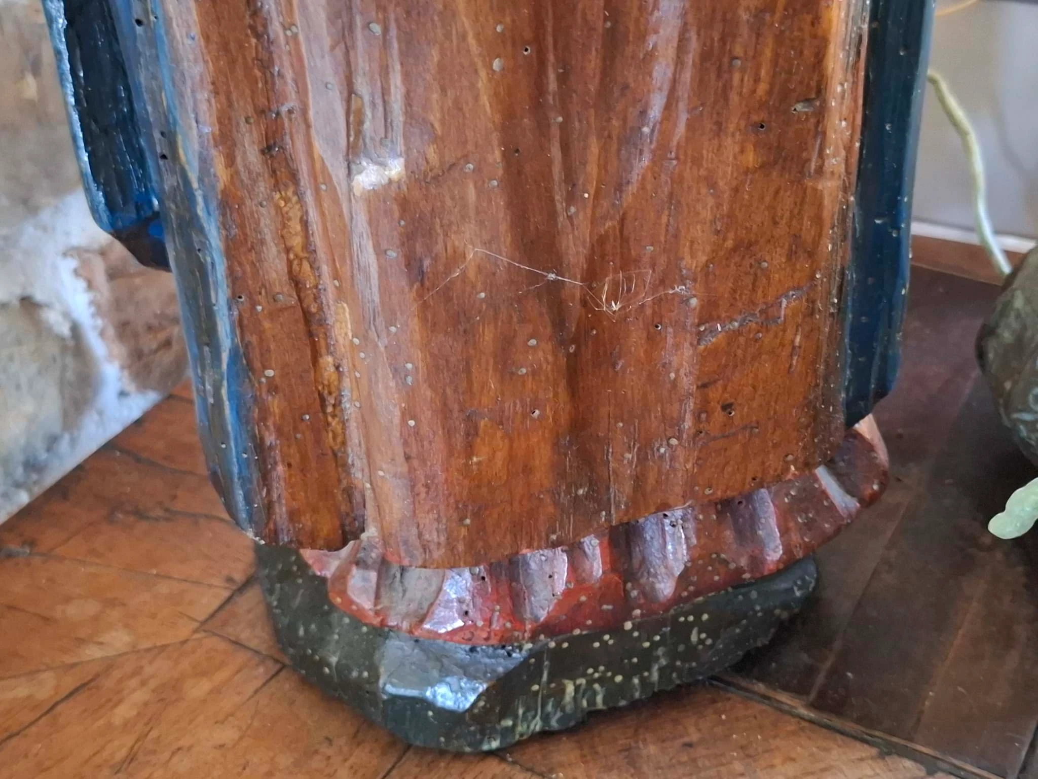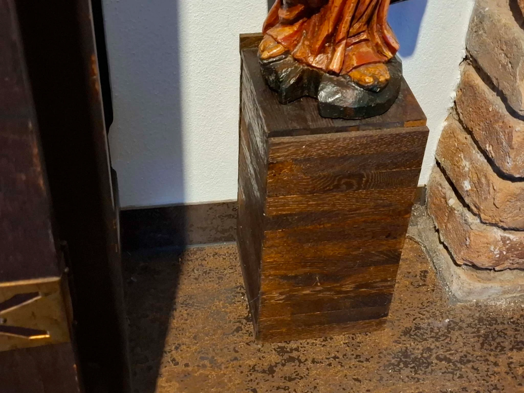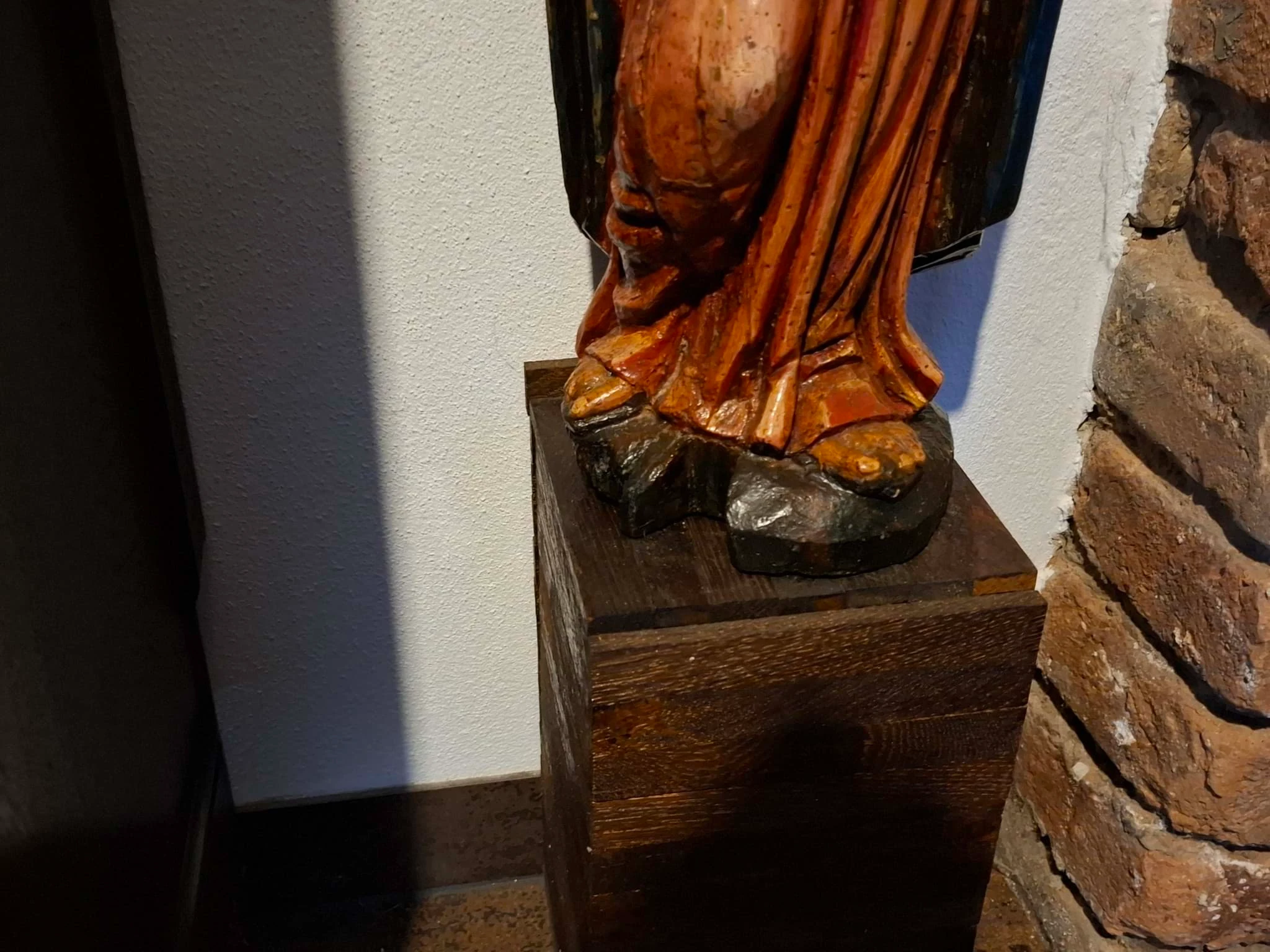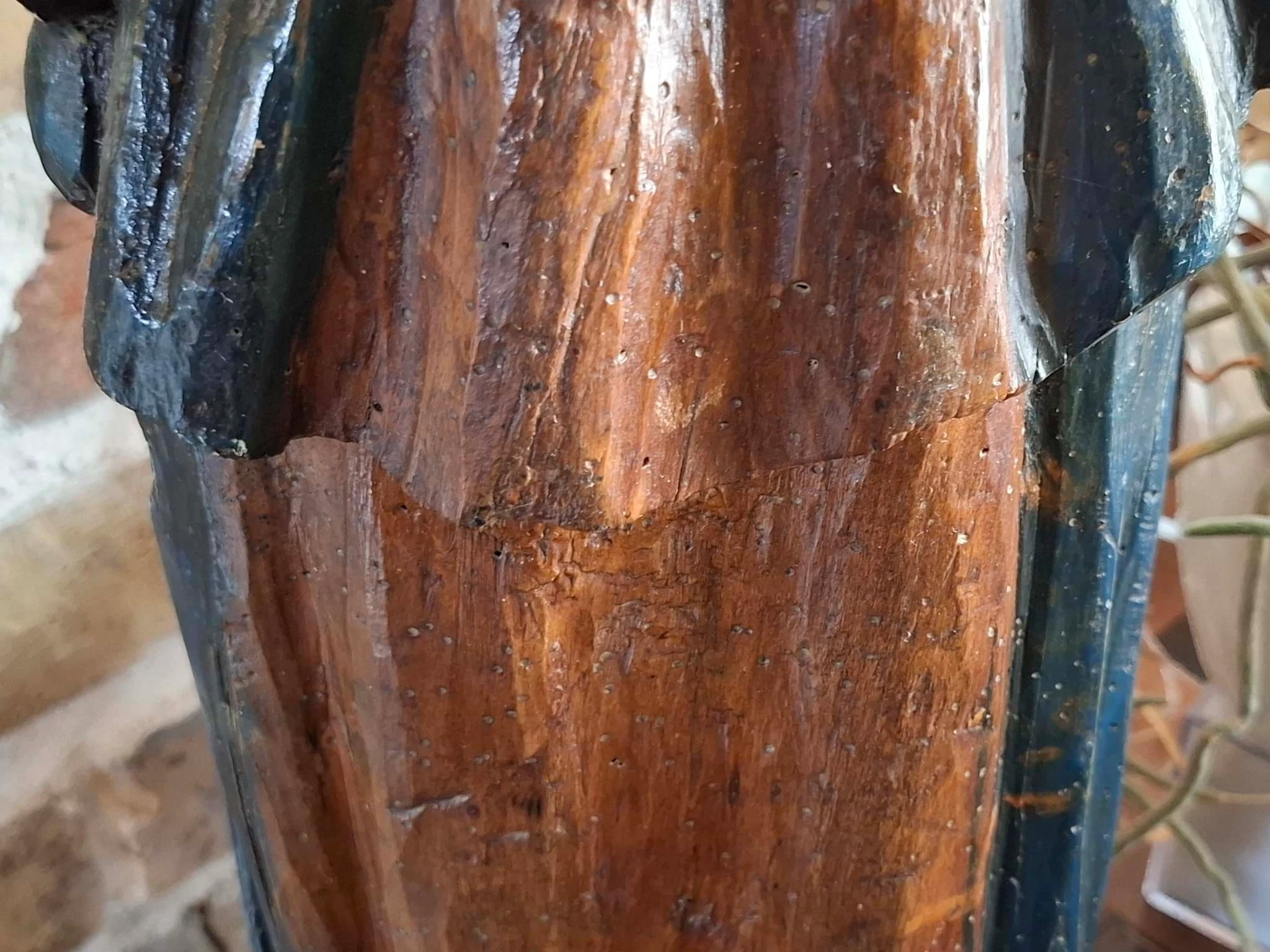 Zustand und Historie: Die Figur wurde in ihrer langen Geschichte mehrmals überfasst, was für religiöse Volkskunst typisch ist, da sie regelmäßig "aufgefrischt" wurde, um die Farben leuchtend zu halten. Die Fassung zeigt die dafür typischen Altersspuren und eine feine Krakelüre (Rissbildung der Malschichten). Am Holzkern sind die üblichen Schwundrisse und Wurmlöcher vorhanden, was die Authentizität des alten Holzes belegt.
