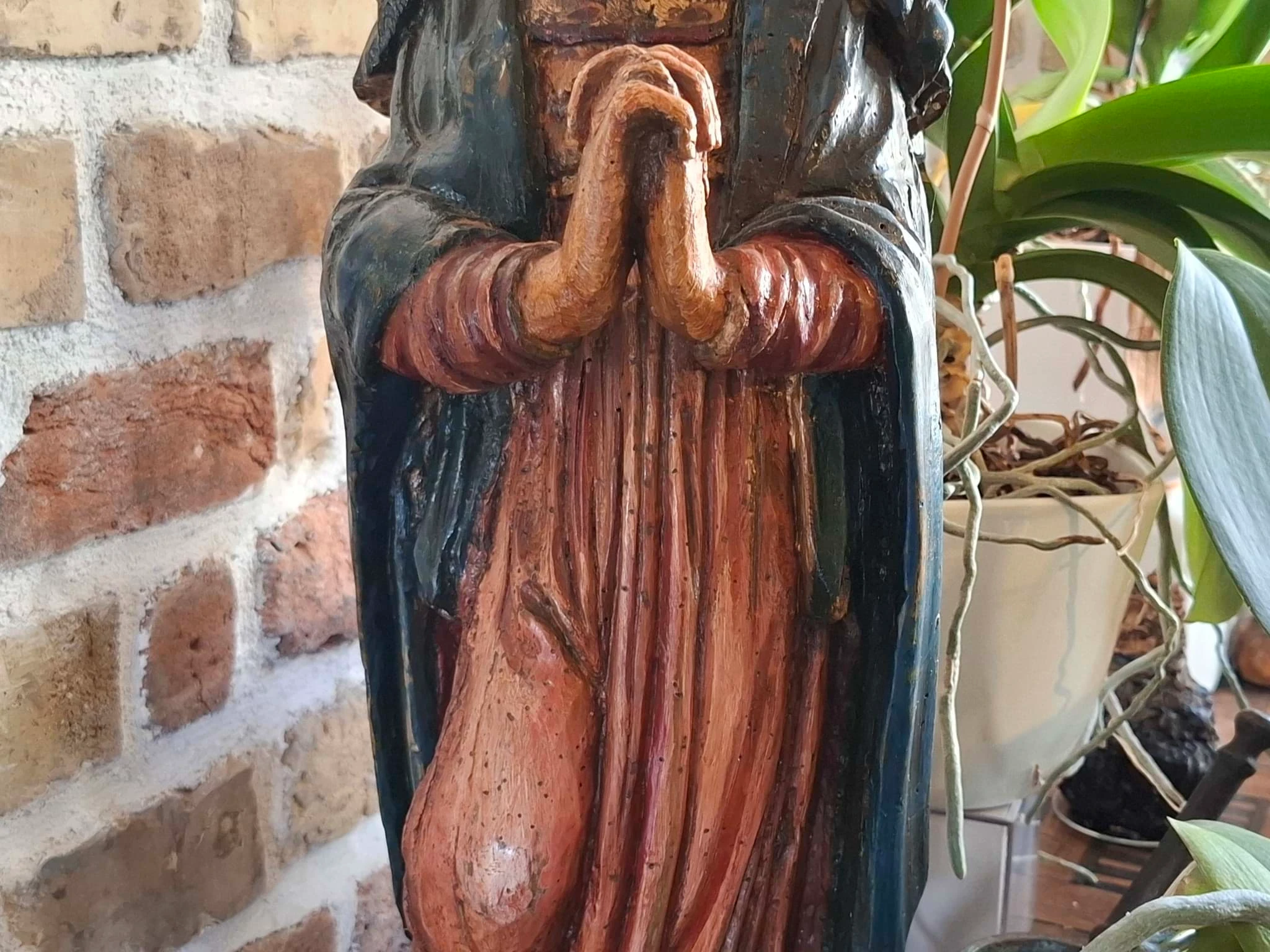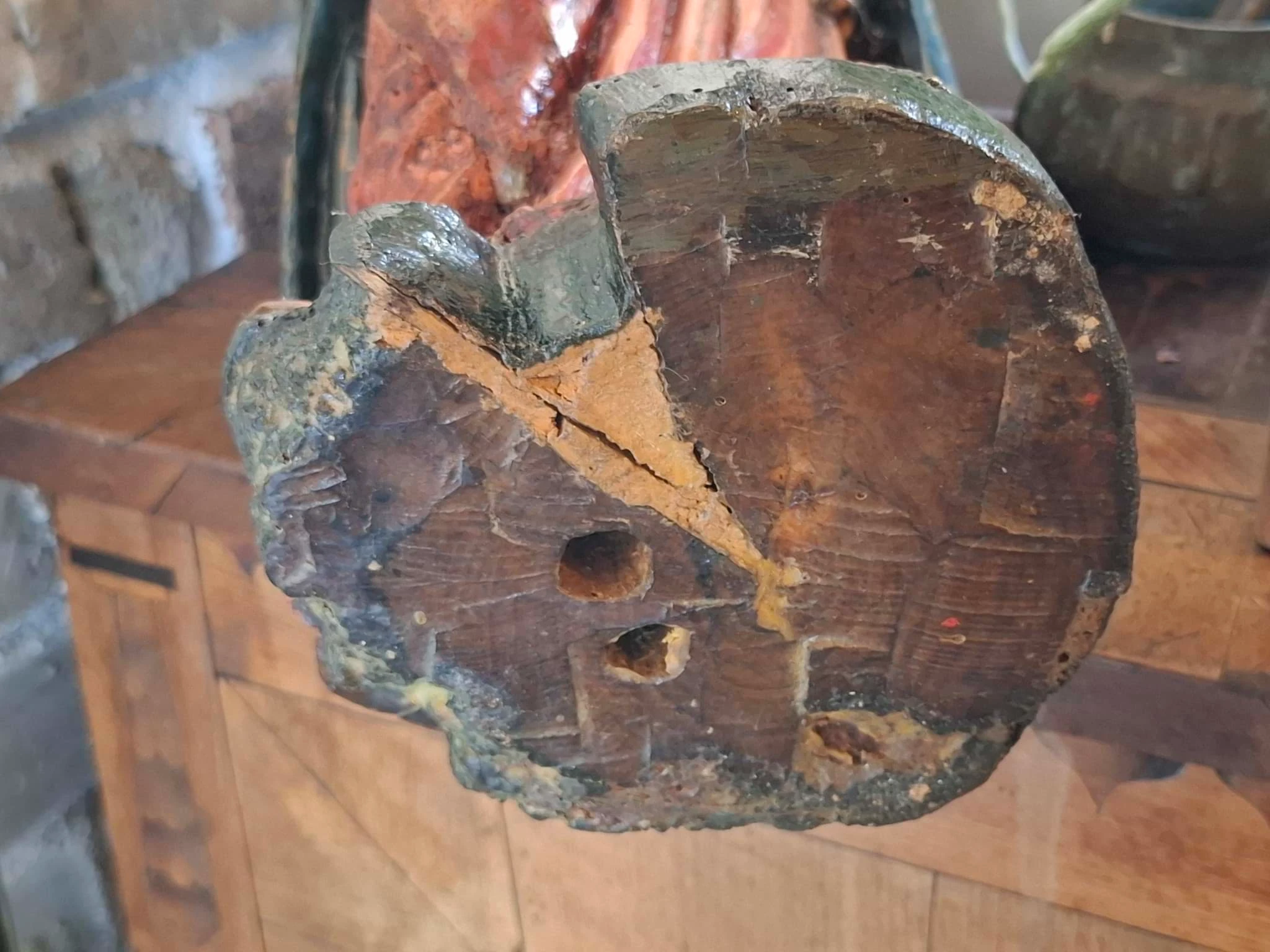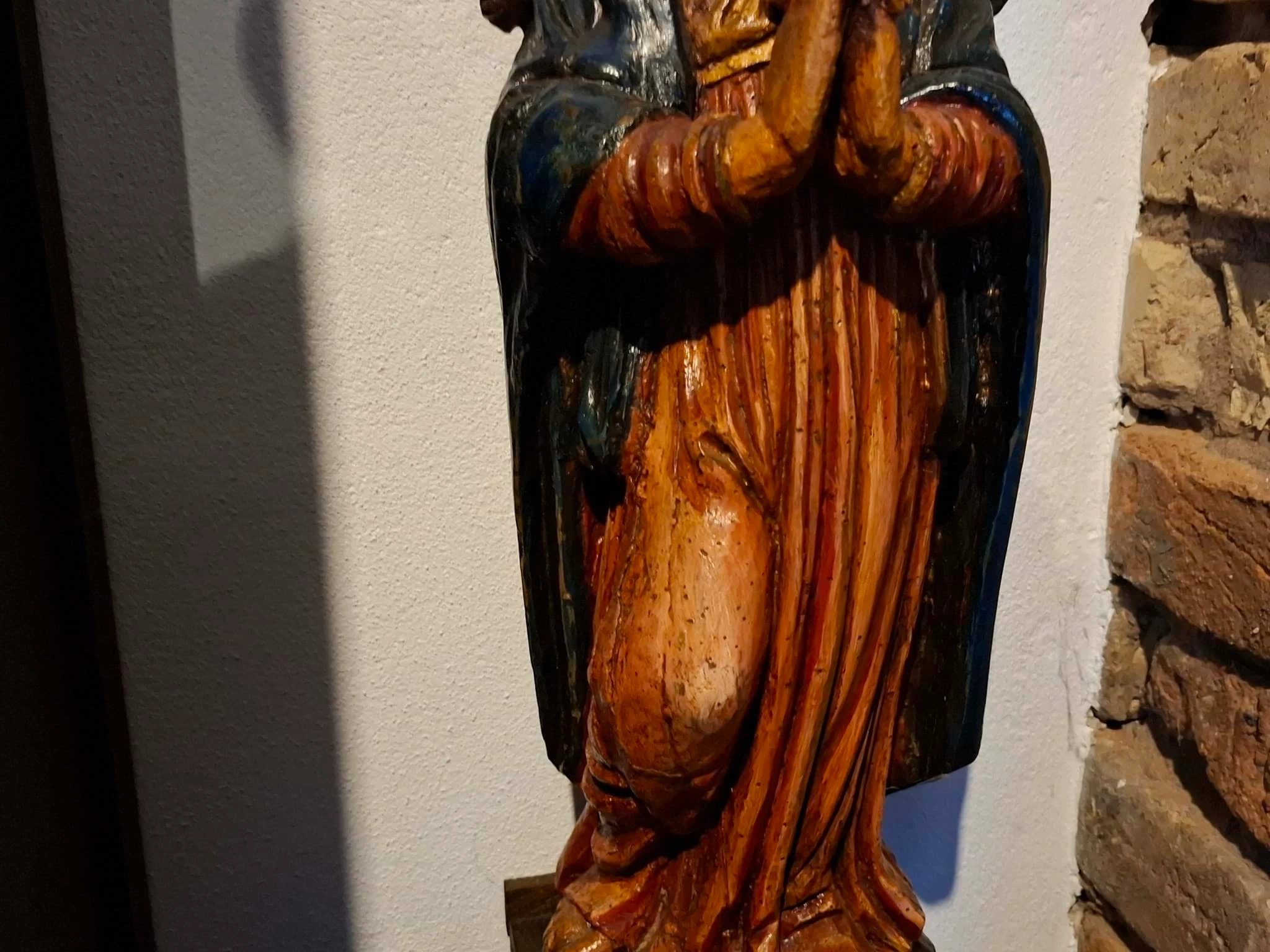 Zustand und Historie: Die Figur wurde in ihrer langen Geschichte mehrmals überfasst, was für religiöse Volkskunst typisch ist, da sie regelmäßig "aufgefrischt" wurde, um die Farben leuchtend zu halten. Die Fassung zeigt die dafür typischen Altersspuren und eine feine Krakelüre (Rissbildung der Malschichten). Am Holzkern sind die üblichen Schwundrisse und Wurmlöcher vorhanden, was die Authentizität des alten Holzes belegt.