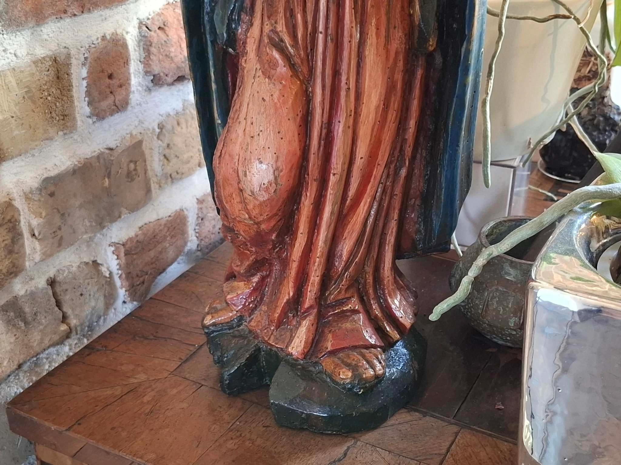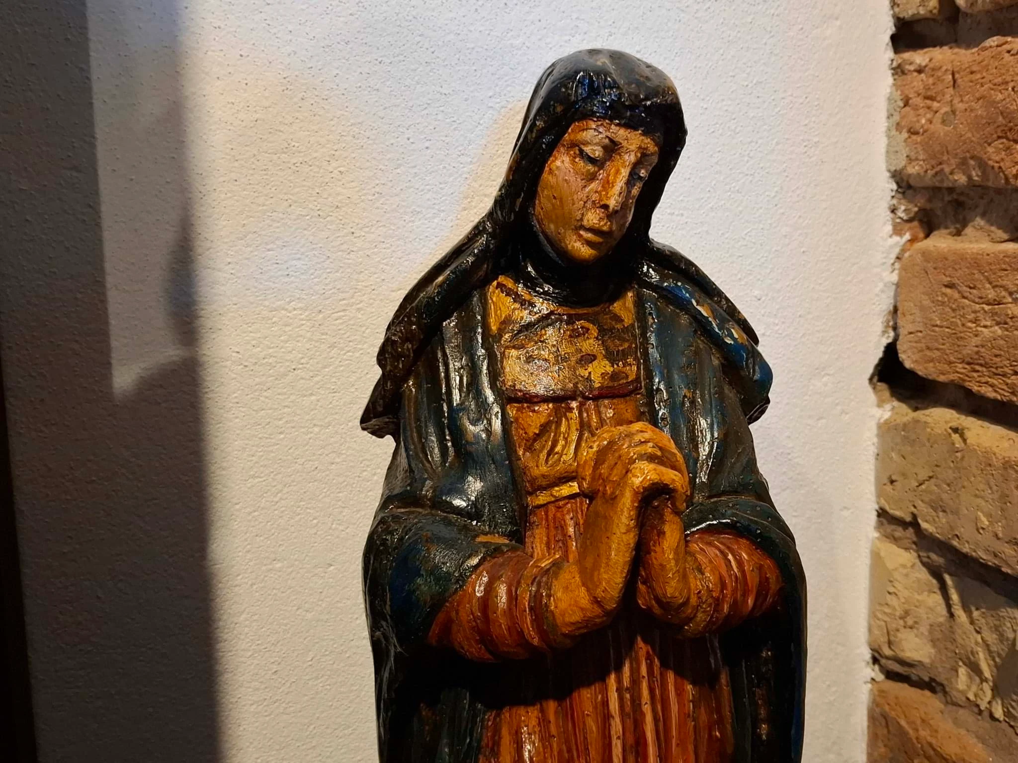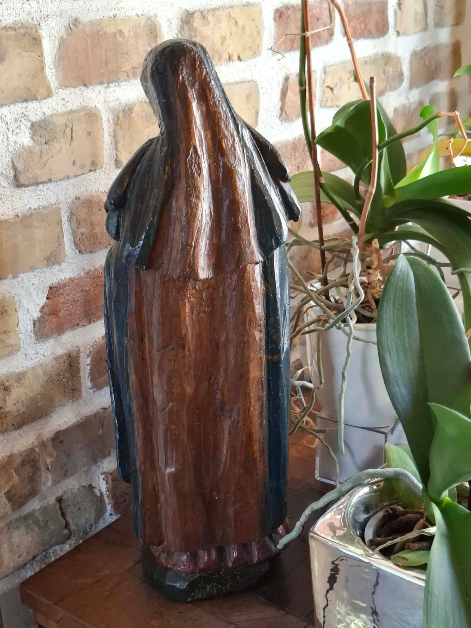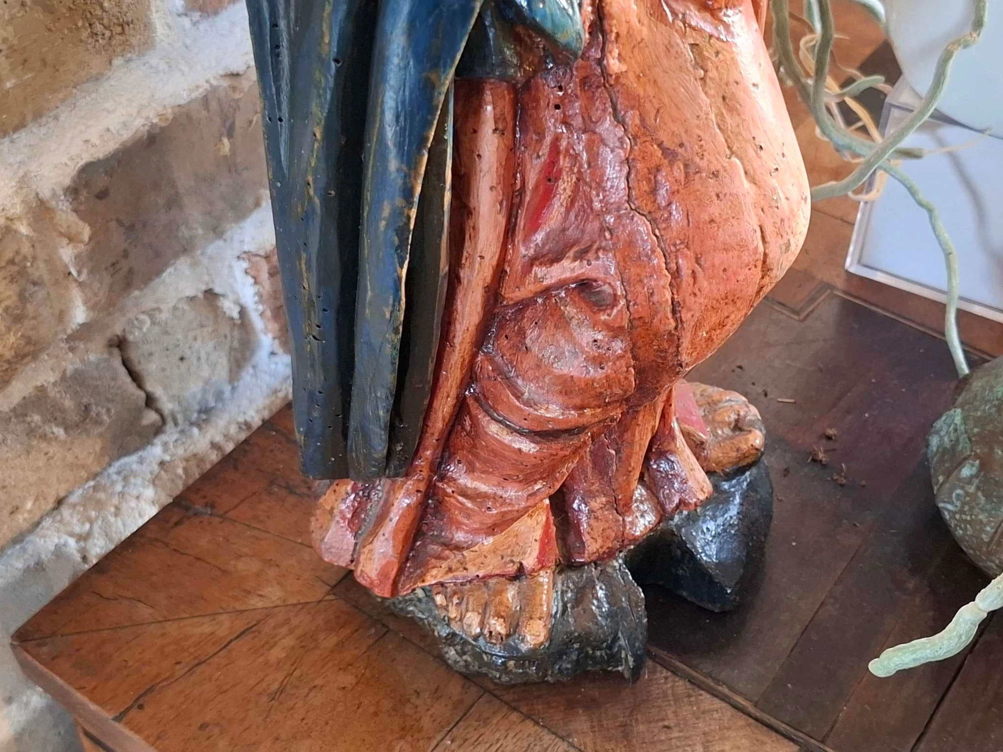 Zustand und Historie: Die Figur wurde in ihrer langen Geschichte mehrmals überfasst, was für religiöse Volkskunst typisch ist, da sie regelmäßig "aufgefrischt" wurde, um die Farben leuchtend zu halten. Die Fassung zeigt die dafür typischen Altersspuren und eine feine Krakelüre (Rissbildung der Malschichten). Am Holzkern sind die üblichen Schwundrisse und Wurmlöcher vorhanden, was die Authentizität des alten Holzes belegt.