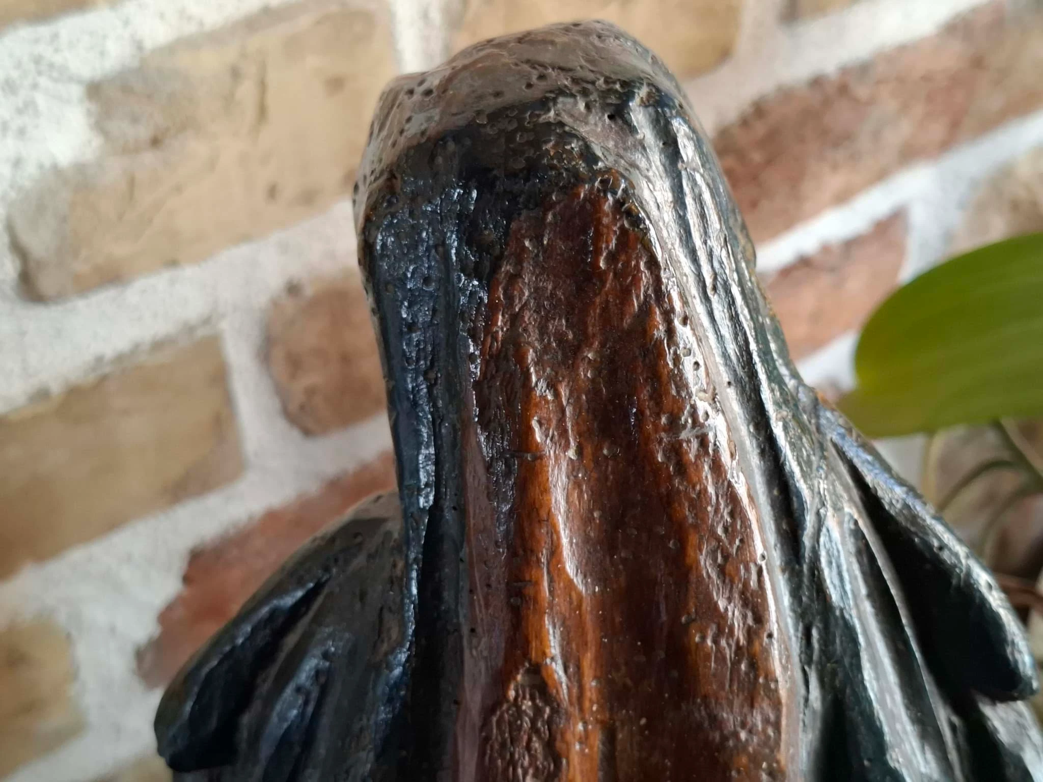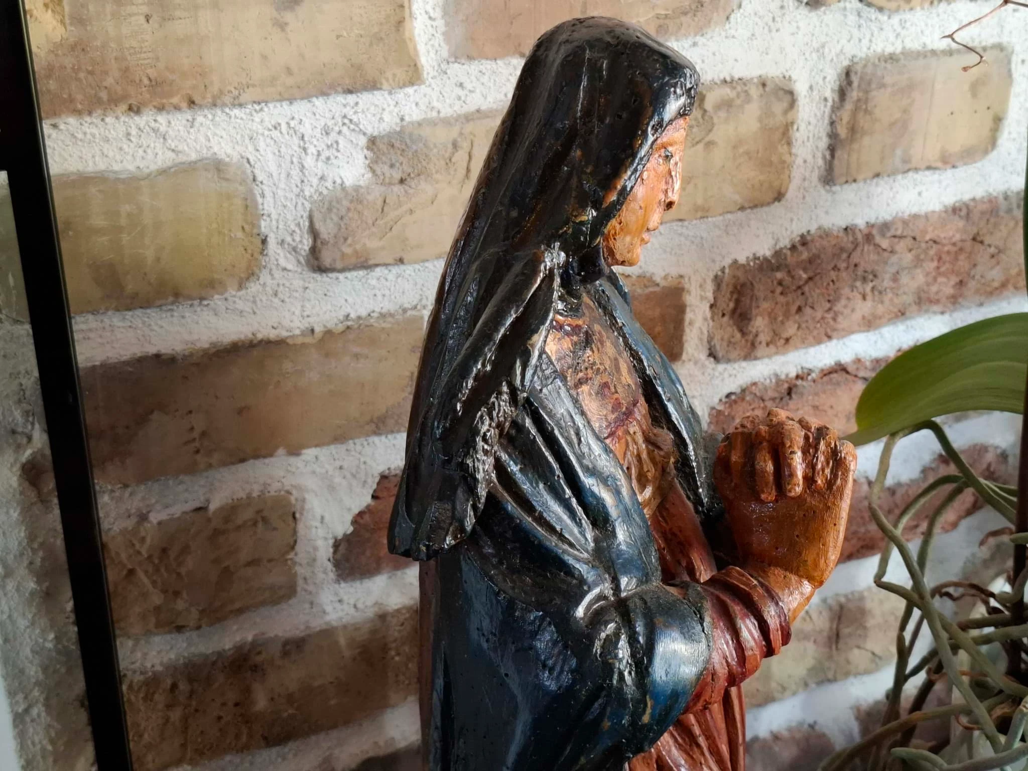 Datierung & Stil: Die Machart, insbesondere die Verwendung der fetten Ölfarbe und die charakteristischen proportionalen Vereinfachungen (wie die markant großen, ineinander geschränkten Hände), weisen das Werk als bäuerliche/volkstümliche Schnitzarbeit der zweiten Hälfte des 19. Jahrhunderts aus. Diese Stilmerkmale zeugen von der schlichten, aber tiefen Frömmigkeit der ländlichen Kunst.