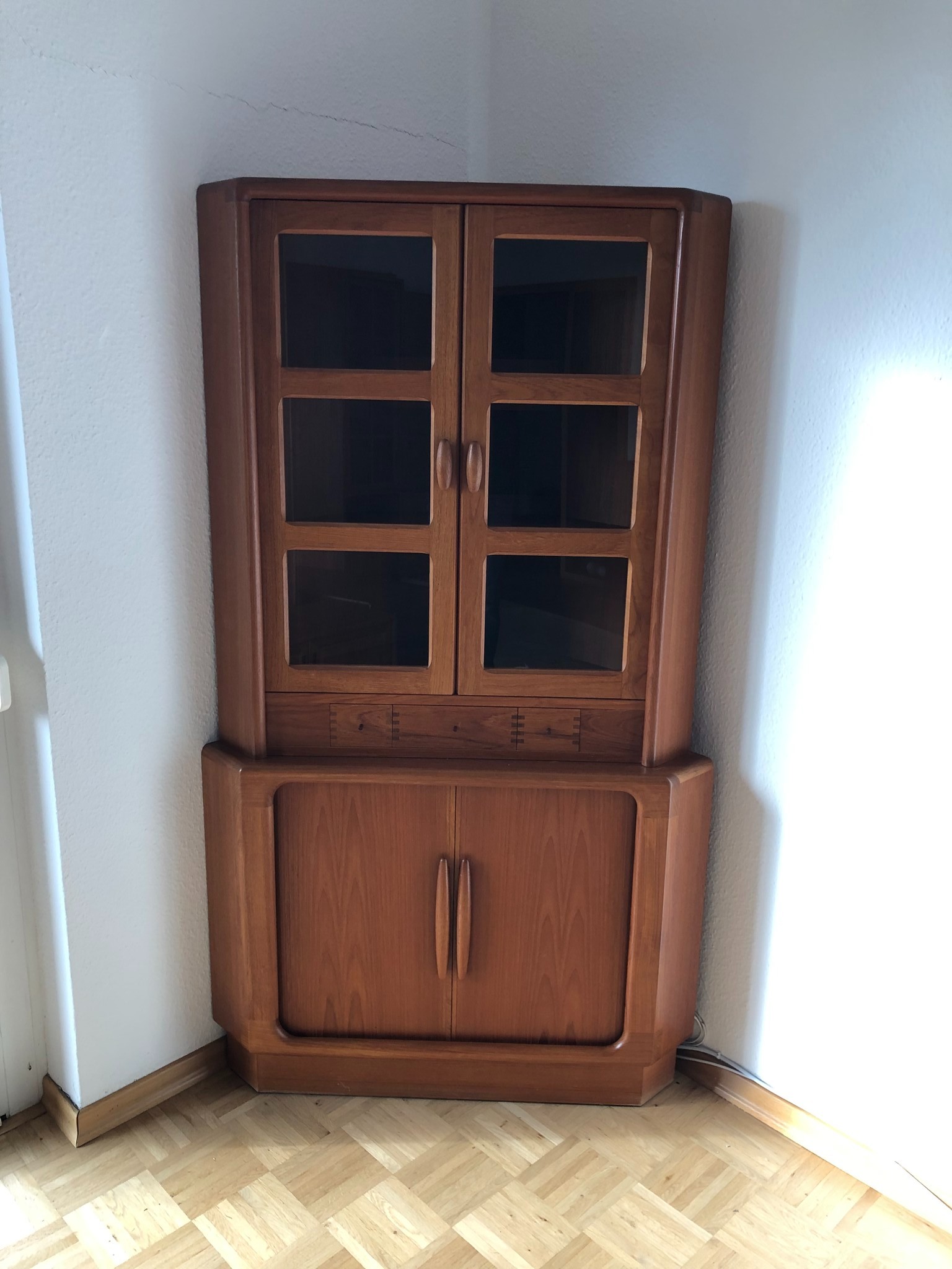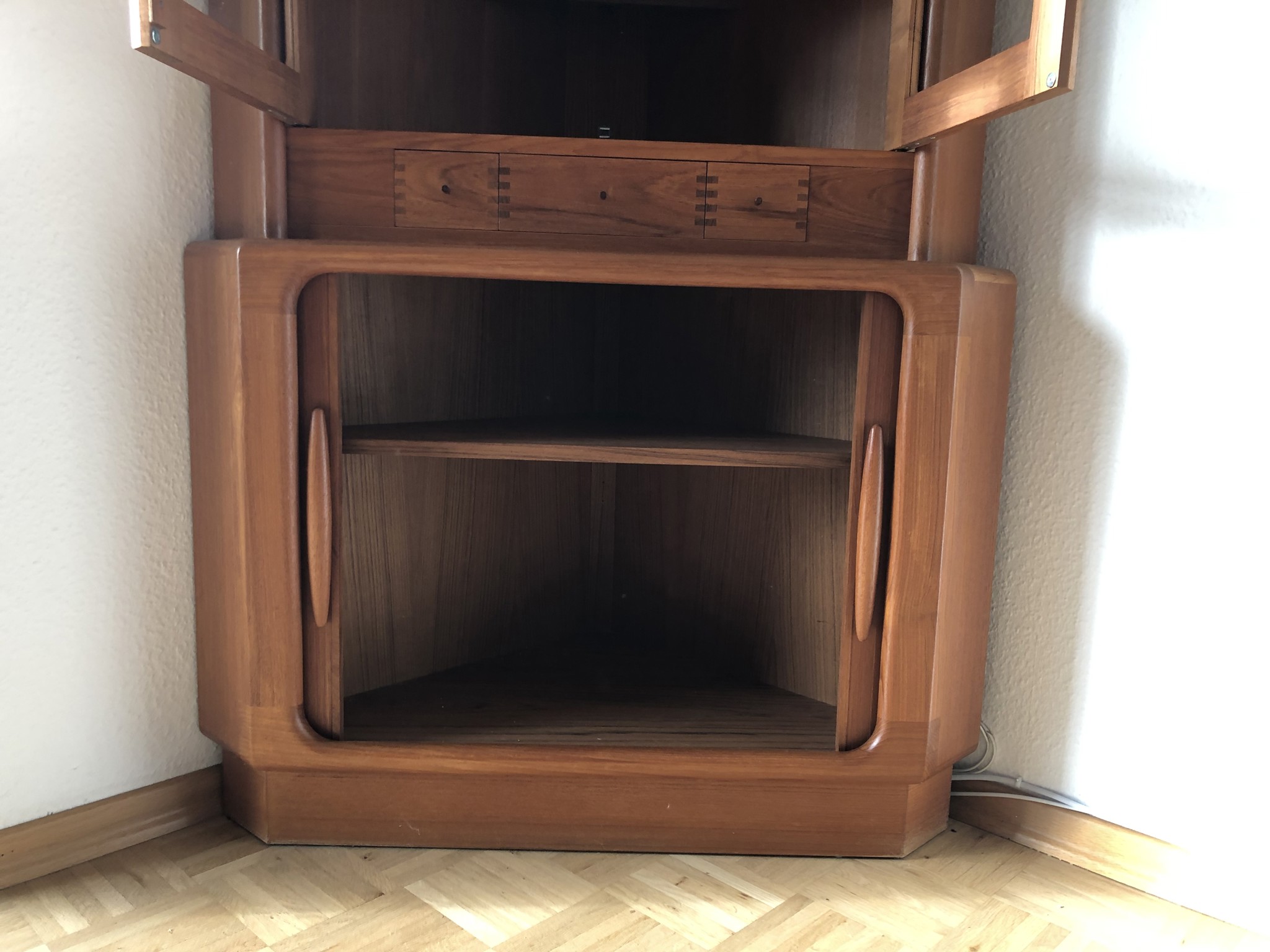 Dieser zweiteilige Eckschrank des renommierten Herstellers Dyrlund ist ein Inbegriff skandinavischer Möbelbaukunst der 1960er Jahre. Er besticht nicht nur durch seine platzsparende Form, sondern vor allem durch handwerkliche Details, die man heute in dieser Qualität kaum noch findet.