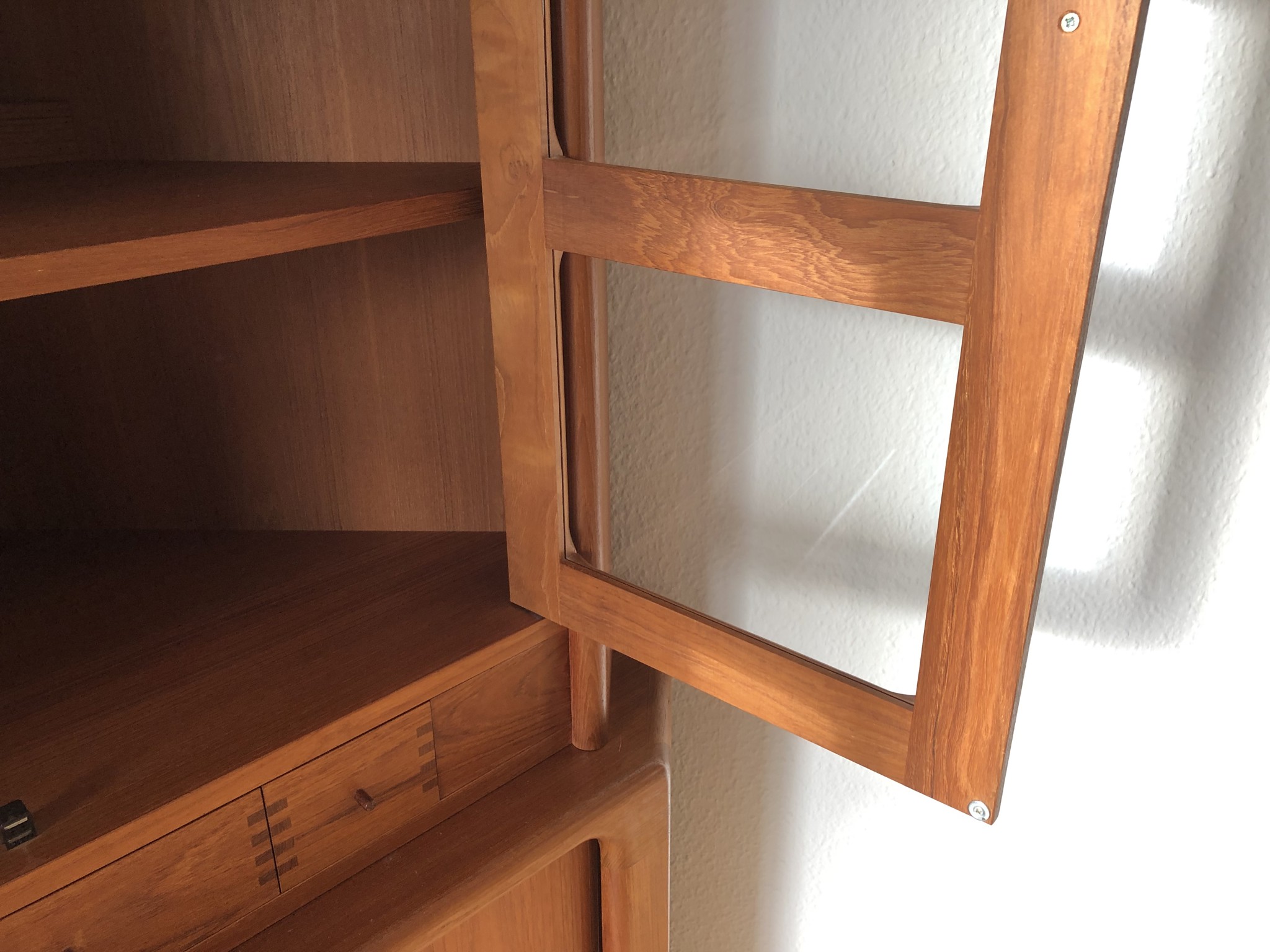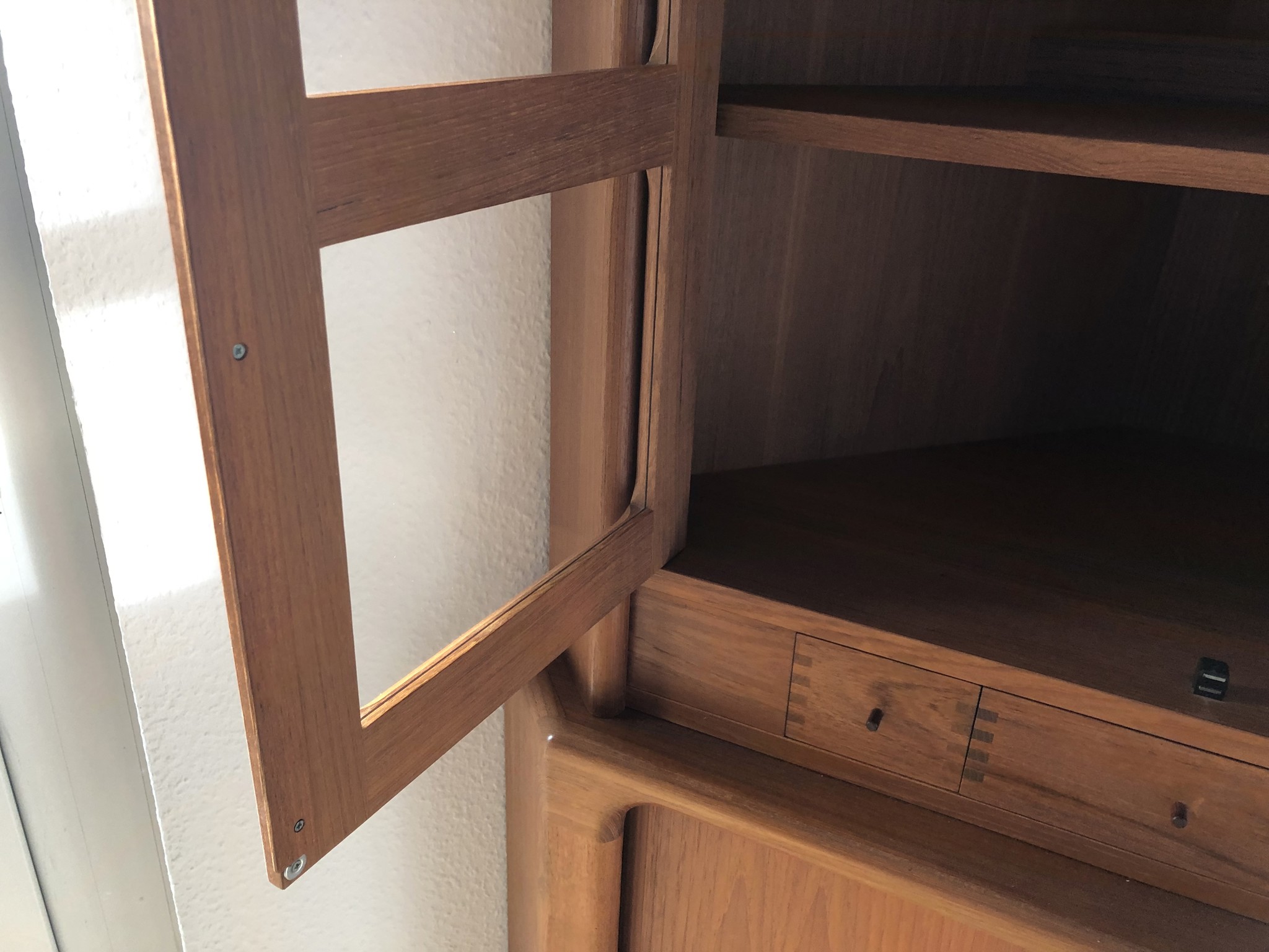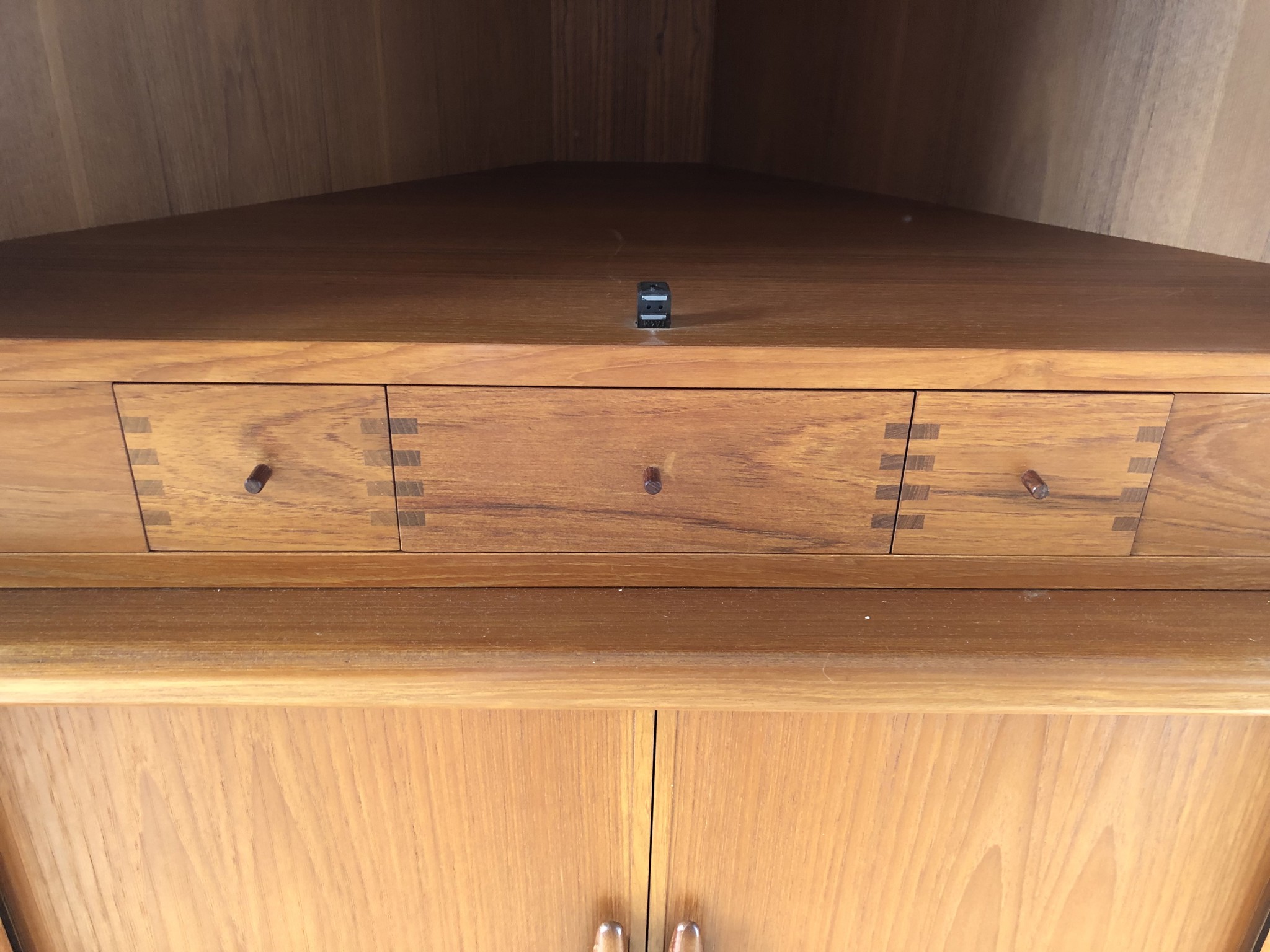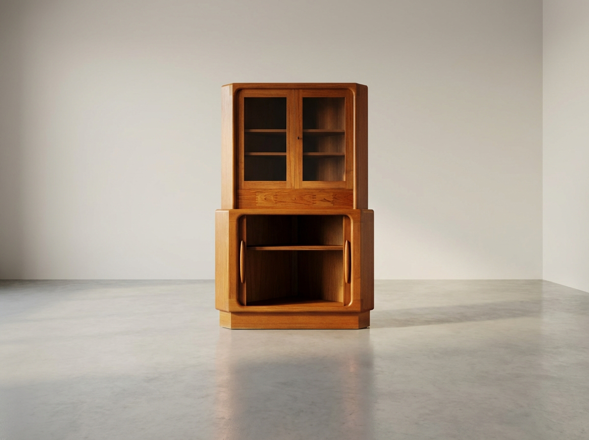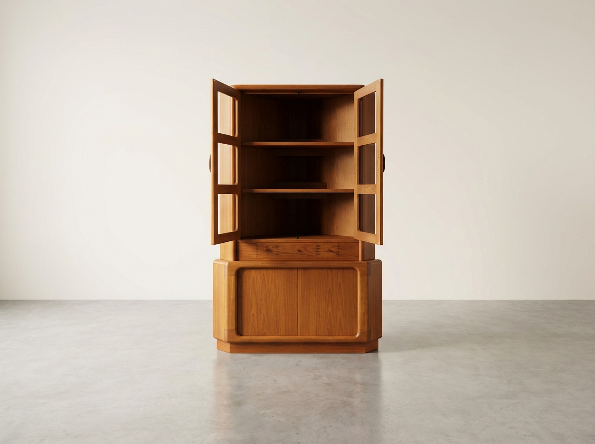 „Dieser Eckschrank ist eine meisterhafte Lösung für anspruchsvolle Wohnräume, in denen jeder Winkel Qualität ausstrahlen soll. Besonders die Kombination aus der indirekten Beleuchtung im Oberteil und den perfekt laufenden Teak-Rollläden im Unterbau macht dieses Modell zu einem seltenen Fundstück. Mein persönliches Highlight sind die handgefertigten Schubladen mit ihrer dekorativen Sicht-Verzahnung – ein Detail, das heute im Möbelbau kaum noch bezahlbar wäre.“