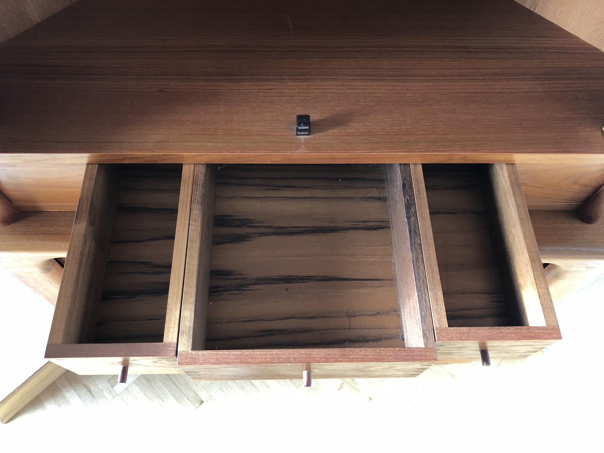 Der Schrank befindet sich in einem sehr guten Vintage-Zustand. Das Holz wurde frisch mit Renuwell behandelt und zeigt einen warmen, tiefen Glanz ohne Kratzer oder Schlieren.