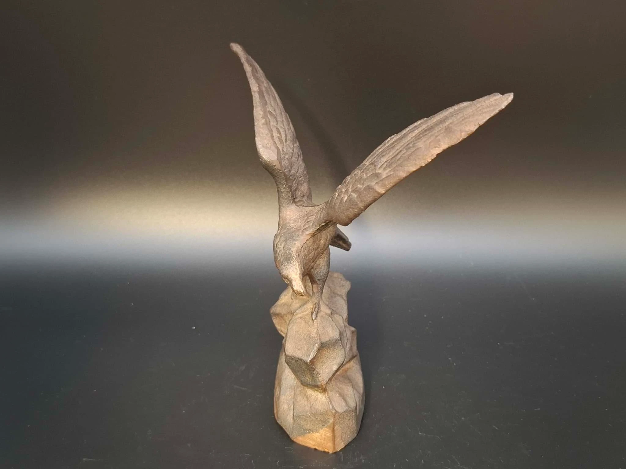 Das 20. Jahrhundert war eine Blütezeit für die Verwendung von Gusseisen in der dekorativen Kunst, und dieses Objekt ist ein Paradebeispiel für die Vorzüge dieses Werkstoffs. Gusseisen zeichnet sich durch seine hohe Dichte, sein signifikantes Eigengewicht und seine extreme Langlebigkeit aus. Die Oberfläche der Figur zeigt die für dieses Material typische, leicht raue Textur, die dem Adler eine rustikale und zugleich edle Anmutung verleiht. Anders als bei polierten Edelmetallen absorbiert und bricht das Gusseisen das Licht auf eine Weise, die die Konturen der Muskulatur und des Gefieders je nach Beleuchtungswinkel plastisch hervortreten lässt. Diese Materialwahl unterstreicht die Robustheit und die Beständigkeit, die das Motiv des Adlers symbolisch verkörpert.