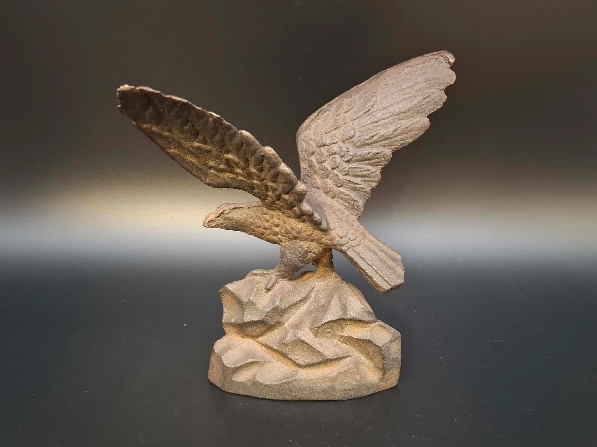 Aus unserer Sicht als Fachhändler repräsentiert dieser Adler die solide Handwerkskunst des 20. Jahrhunderts. Objekte dieser Art wurden geschaffen, um zu überdauern, und haben ihren Reiz über die Jahrzehnte nicht verloren. Die Kombination aus dem industriellen Charme des Gusseisens und der naturalistischen, lebendigen Formgebung macht dieses Stück zu einem begehrenswerten Objekt für Interieurs, die Geschichte und Charakteratmen. Wir haben den Erhaltungszustand geprüft und bestätigen die Integrität der Form sowie die authentische Ausstrahlung, die dieses Stück zu einer wertvollen Ergänzung für jede Sammlung macht.
