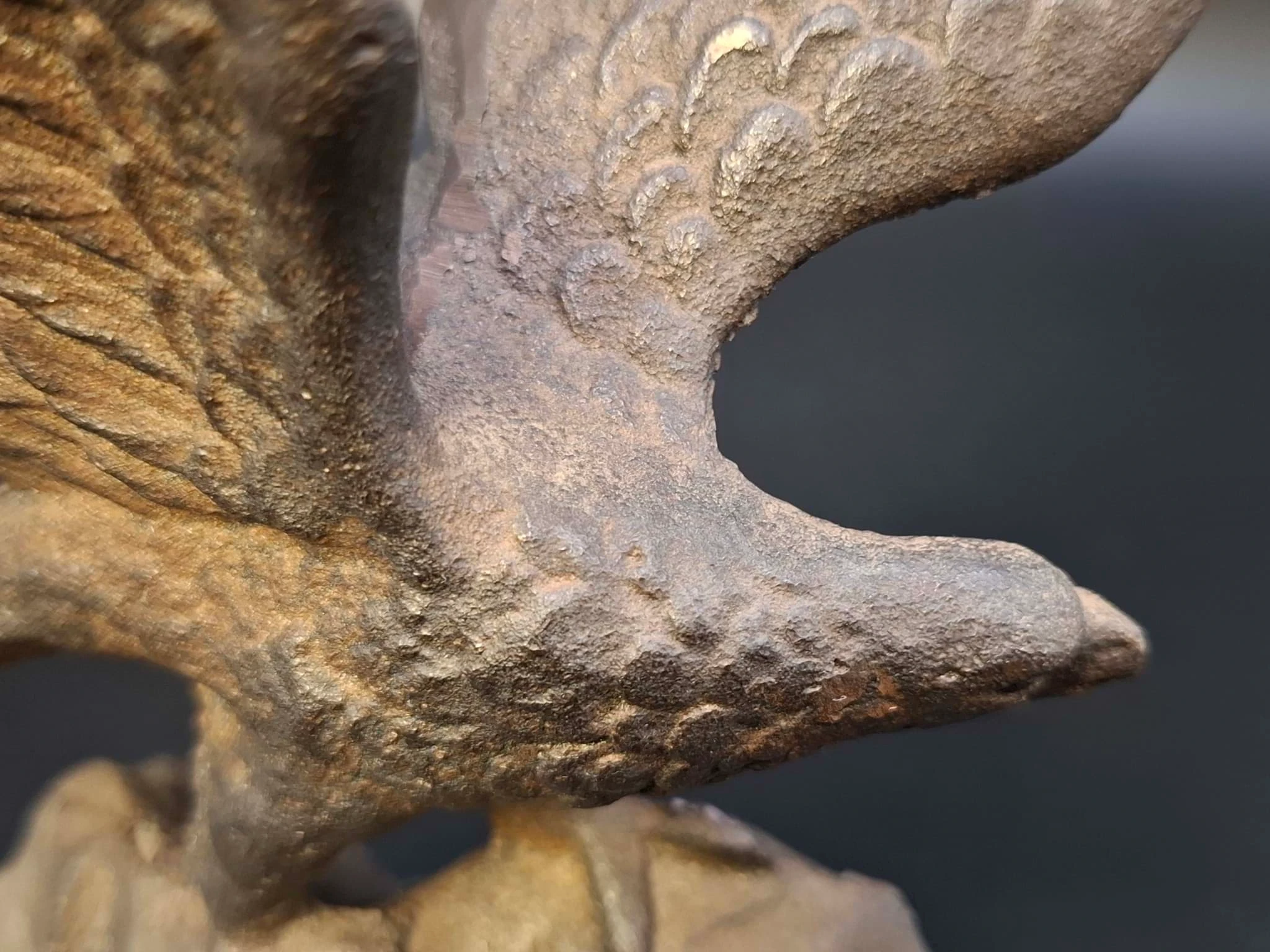 Zusammenfassend lässt sich sagen, dass dieser gusseiserne Adler durch seine lebendige Darstellung des Abflugs, die versetzte Flügelstellung und die robuste Materialität überzeugt. Er ist ein Ausdruck von Stärke und Freiheit, eingefangen in einem beständigen Werkstoff, das durch unsere Expertise als hochwertiges historisches Objekt verifiziert wird.