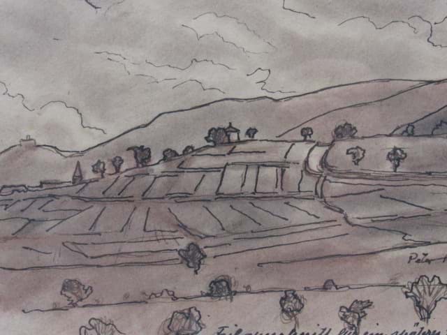 Peter Koch (1874-1956), aquarellierte Tuschezeichnung einer Landschaft Studie mit Weinbergen und dem Hambacher Schloss
