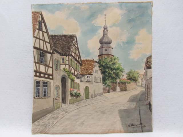 Aquarell Dorfstraße mit Kirche, sign. u. dat. W. Wollweber 1956