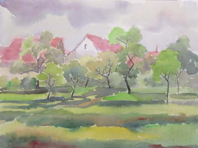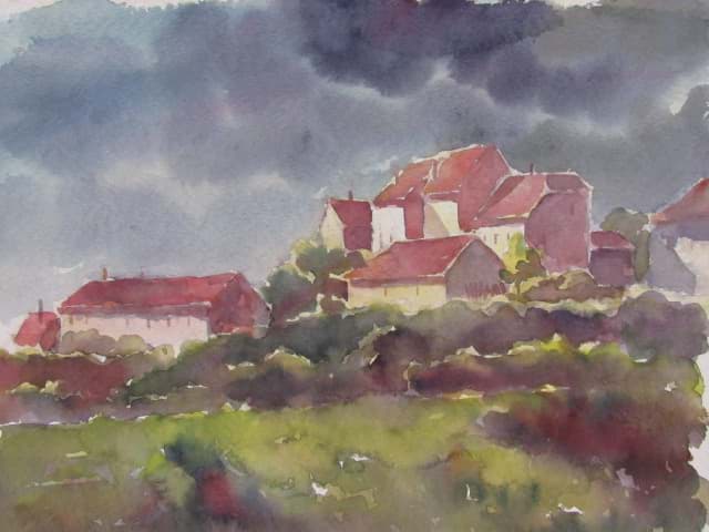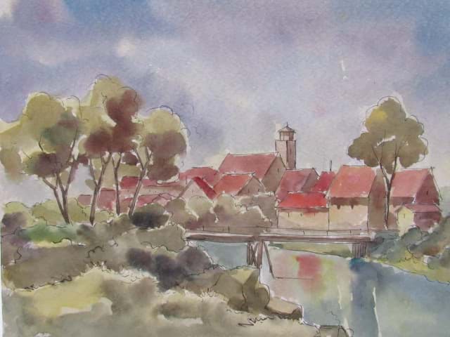 Aquarell Zeichnung Blick auf ein Dorf, Expressionismus