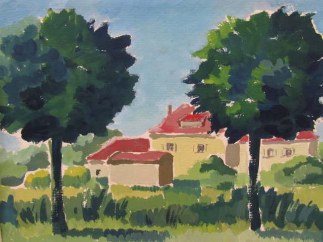 Expressionistische Malerei Mischtechnik, Blick durch Bäume auf eine Häusergruppe