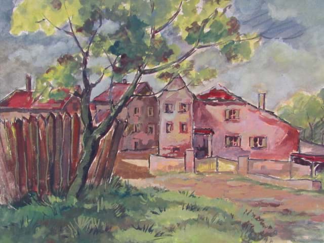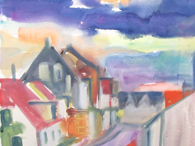 Aquarell Zeichnung Blick auf eine Häusergruppe, Expressionismus