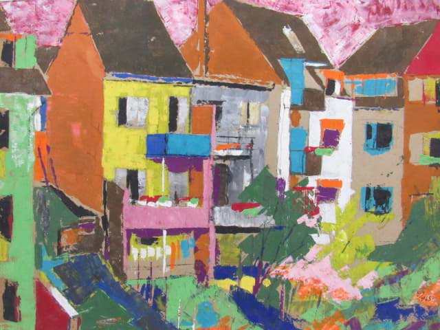 Stadtblick auf Häuser & Bäume, Mischtechnik, Expressionismus