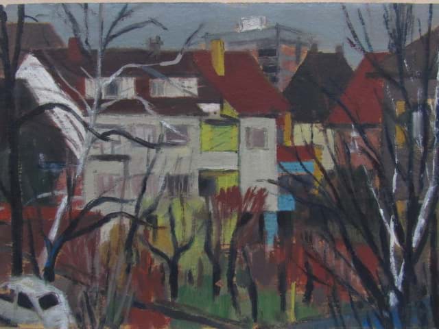 Expressive Malerei, Gemälde Architektur Nachkriegsmoderne mit Blick auf Häuser, monogr. & dat.