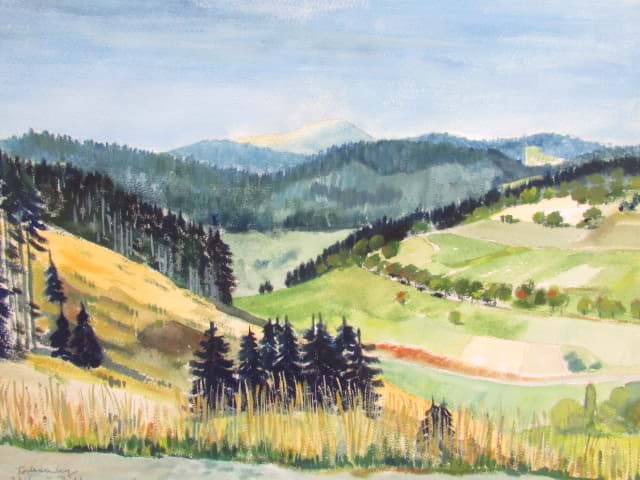 Fernblick Landschaft Aquarell in Mischtechnik, undeutlich signiert & datiert