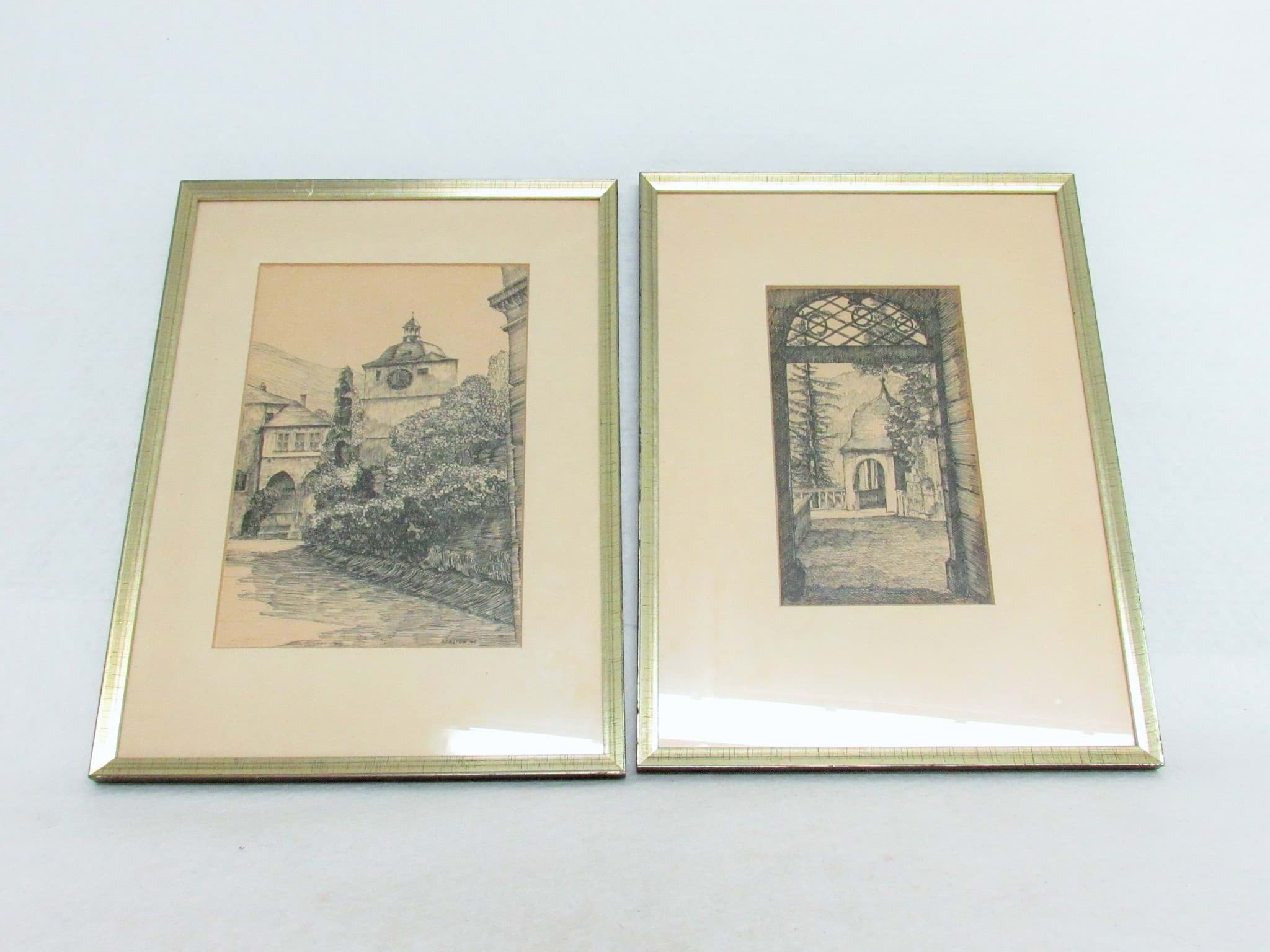 Heidelberger Schloss, zwei Federzeichnungen Schlosshof & Schlossaltan, signiert Rebstein