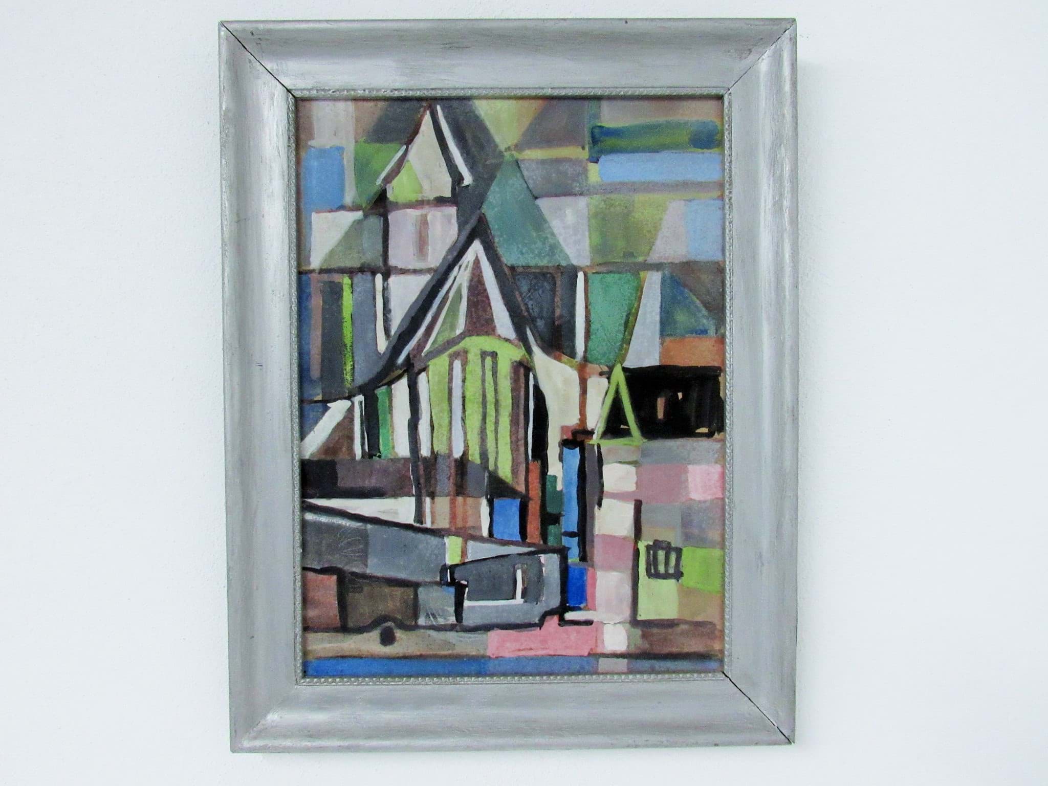 Abstrakte Kirche, Gouache, Deckfarben auf Kartonplatte, 60er Jahre, gerahmt