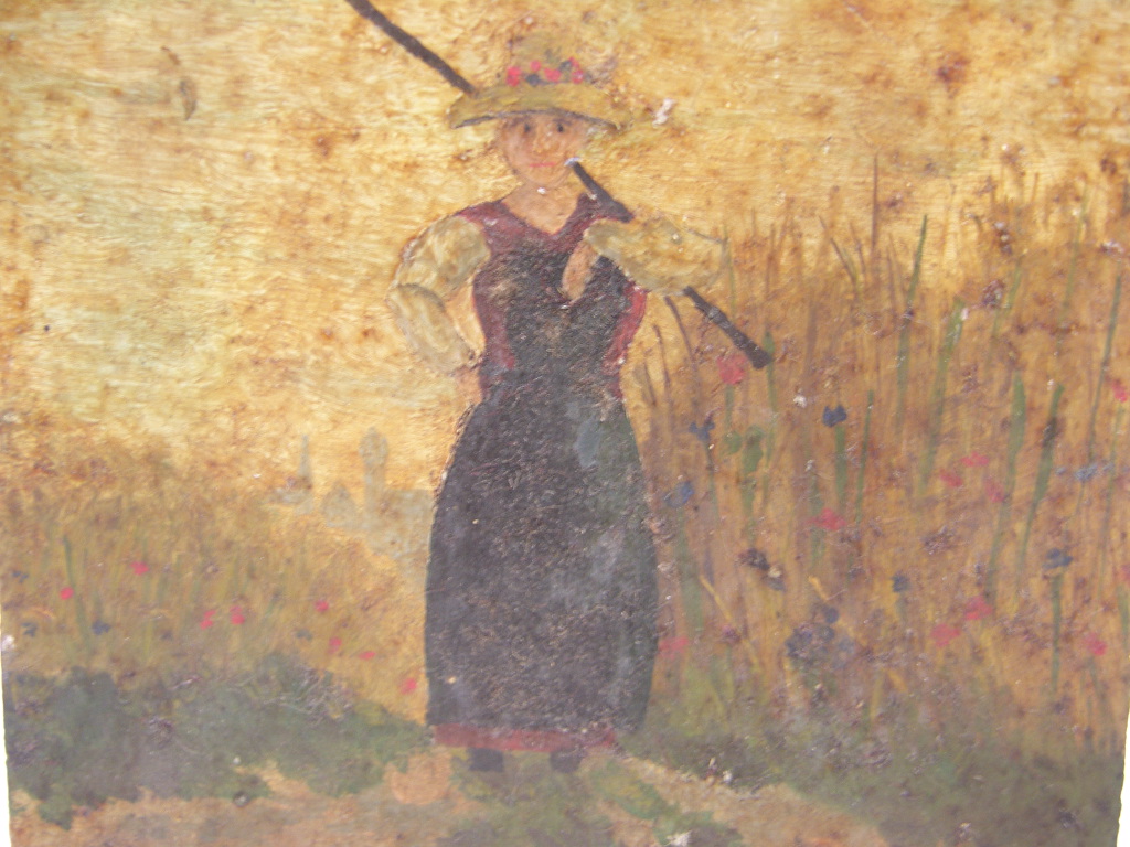 Ölgemälde Bäuerin mit Mistgabel, dat. 1807, Öl auf Holzplatte, unten links monogrammiert I.C.