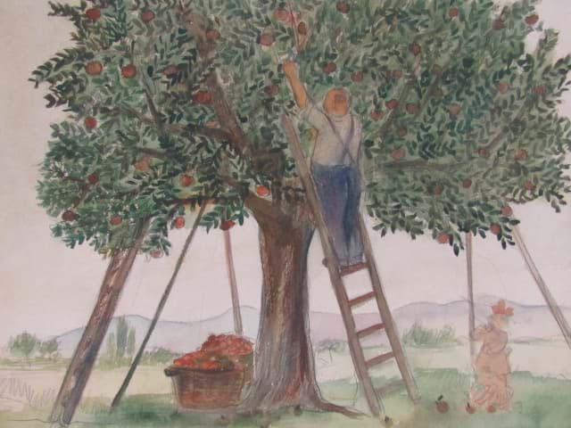 Aquarell Zeichnung bei der Früchte Ernte, Naive Malerei