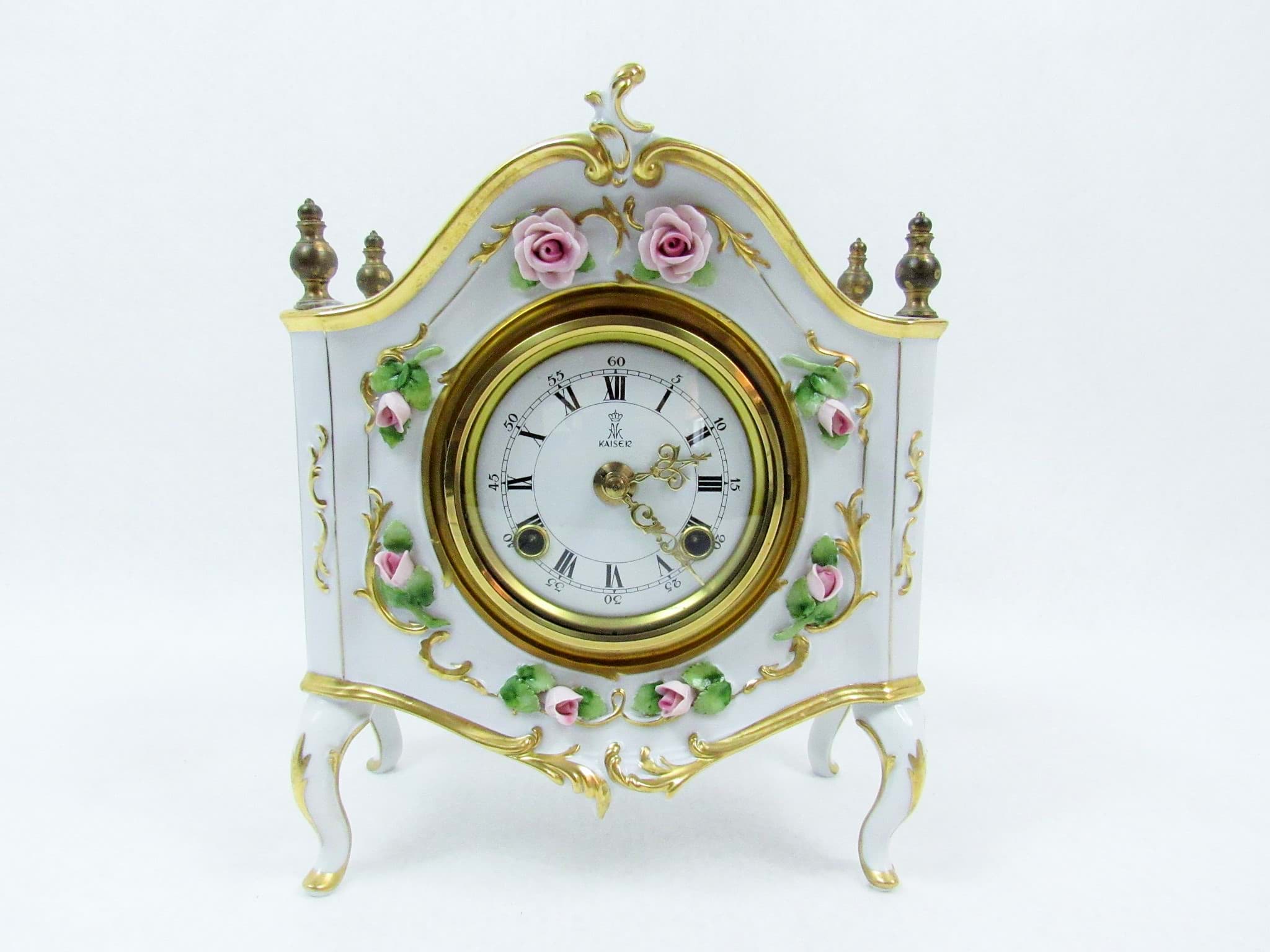 AK Kaiser Tischuhr aus Porzellan mit mechanischem Franz Hermle Uhrwer 130-070, Stunden & Halbstunden-schlag auf zwei Glocken, Barock / Rokoko Stil
