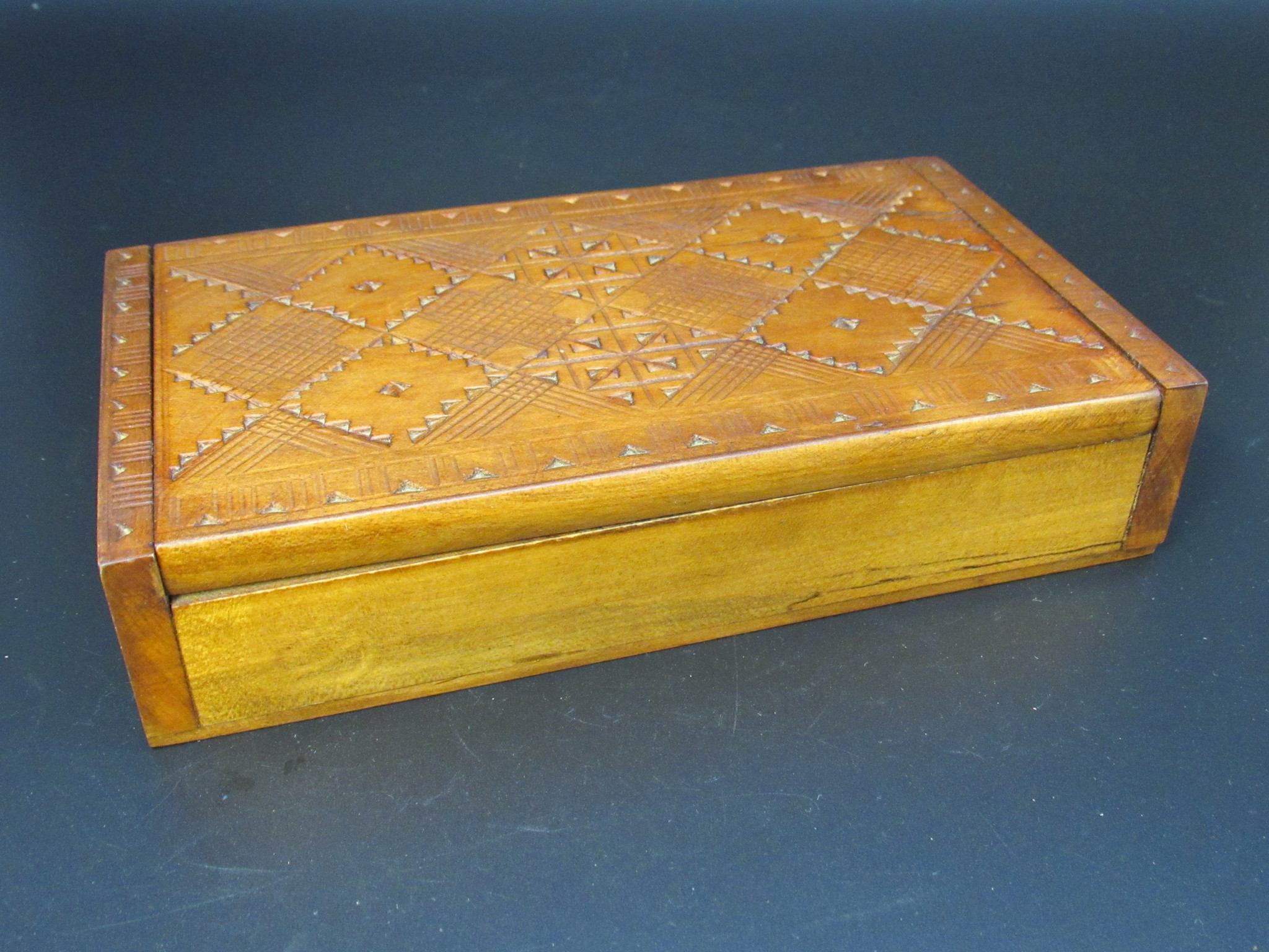 Design: Deckel mit aufwendiger, geometrischer Flachschnitzerei (Rauten- und Gittermuster).