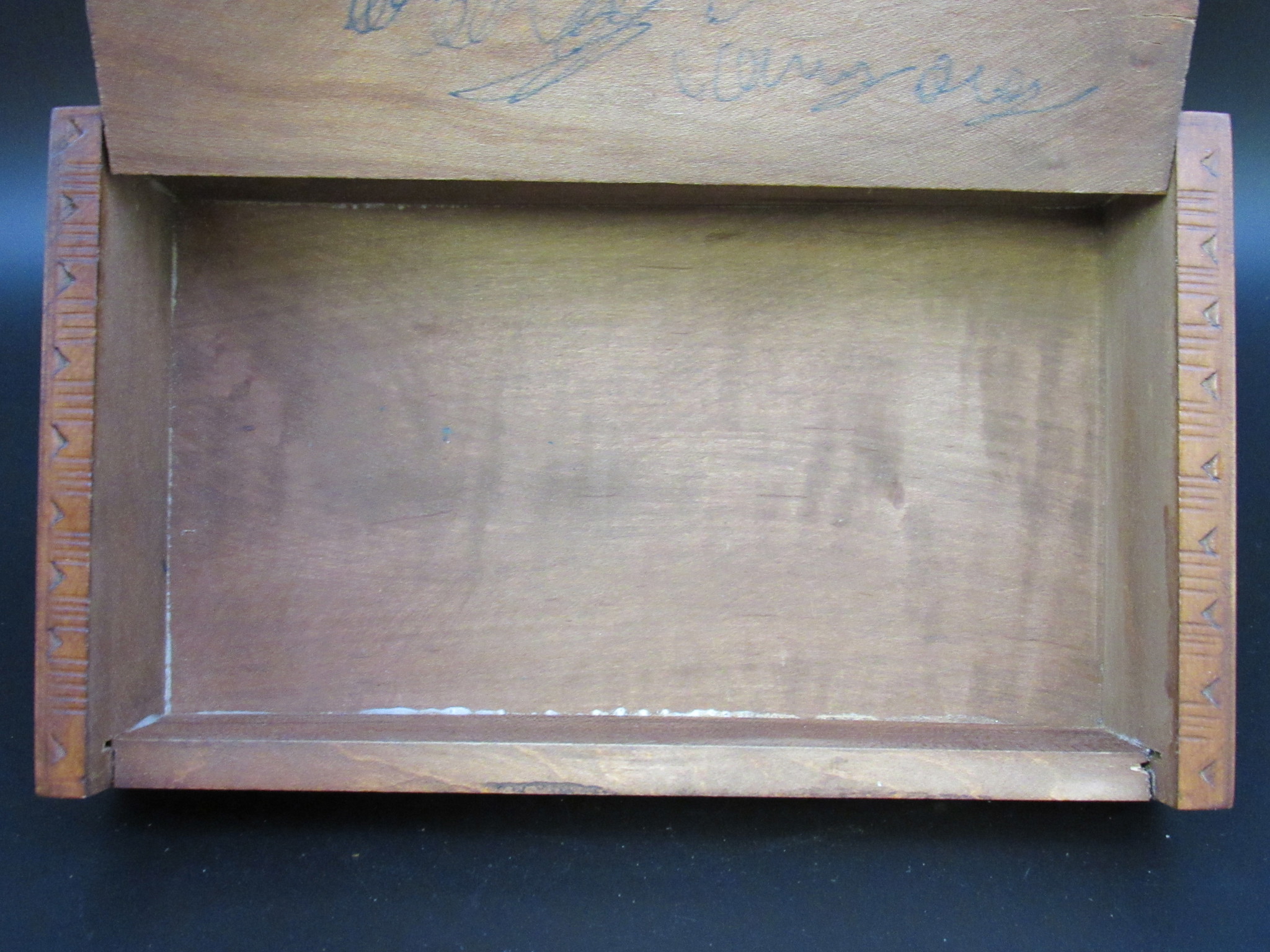 Zustand: Äußerlich in einem sehr schönen Zustand mit toller Patina. Einzig die Innenseite des Deckels ist verkritzelt (siehe Hinweis), was den äußeren Charme jedoch nicht mindert.