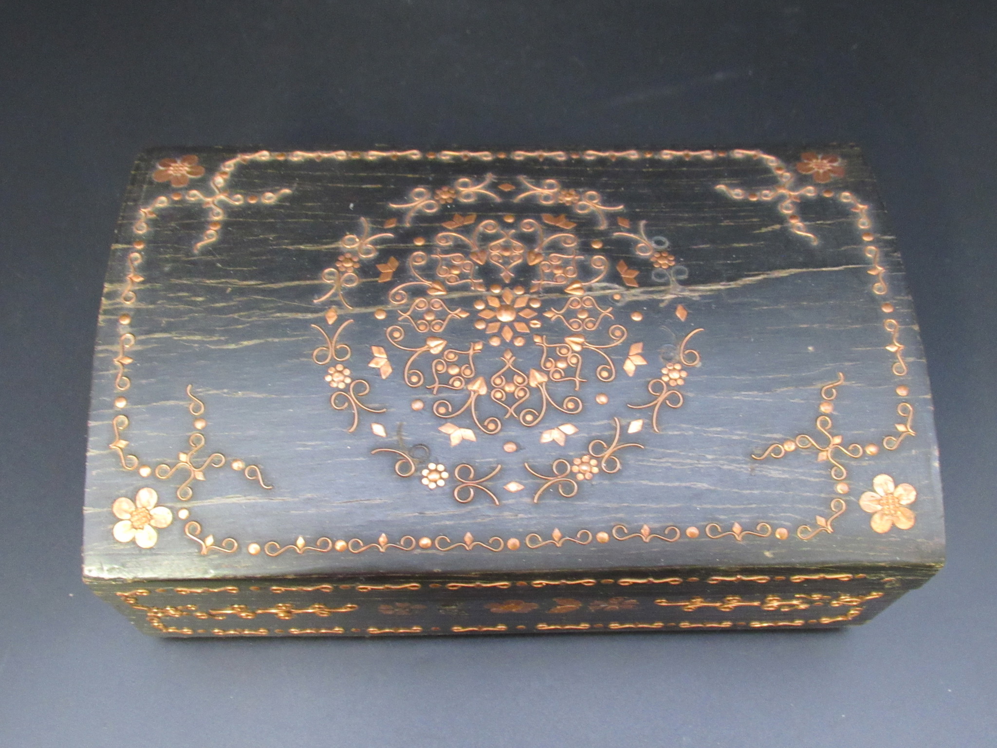 Zustand: Authentischer Vintage-Zustand mit schöner Patina. Das ebonisierte Holz weist altersbedingte Schwundrisse auf; das Kupferdekor ist partiell unvollständig (siehe Fotos), was den antiken Charme unterstreicht.